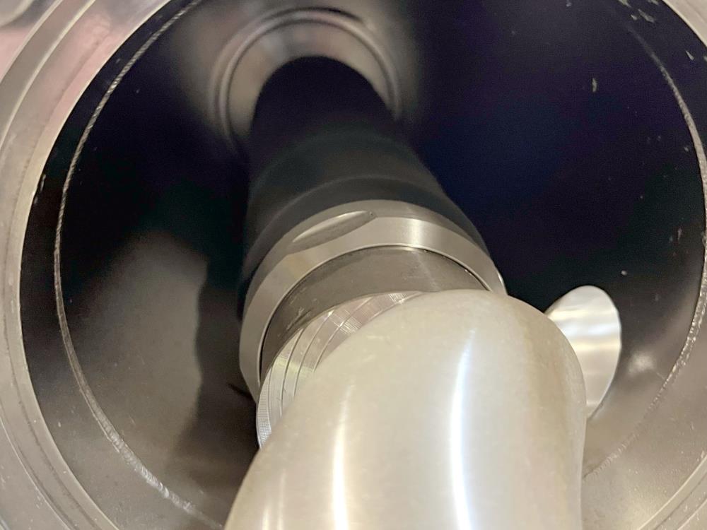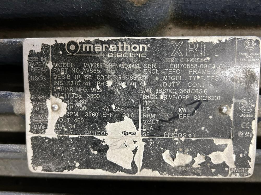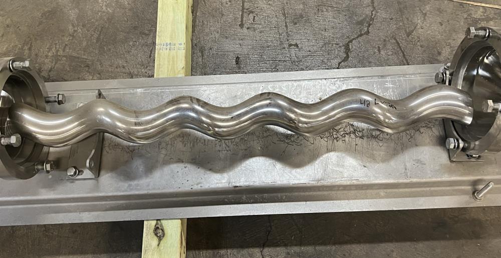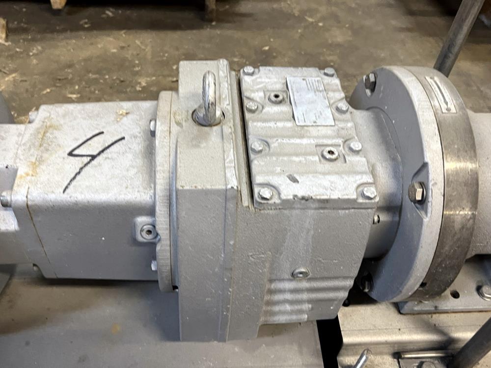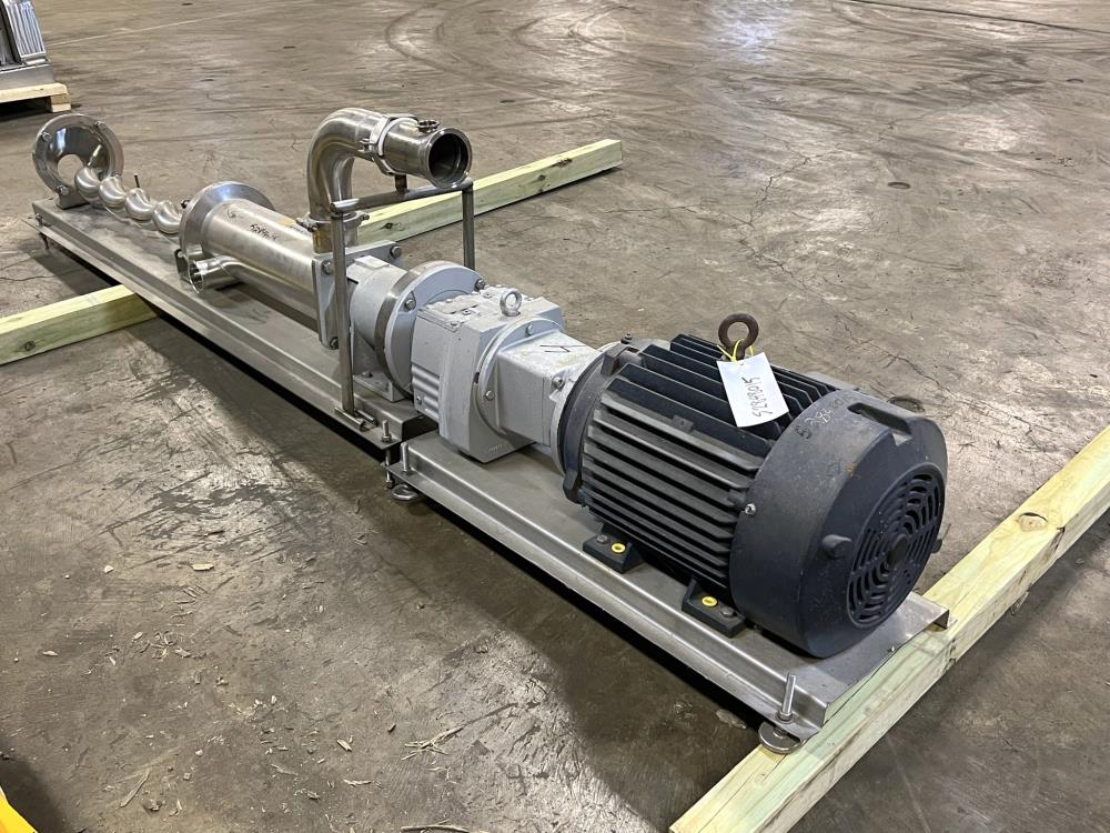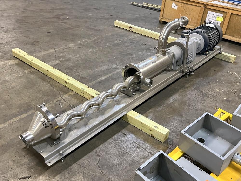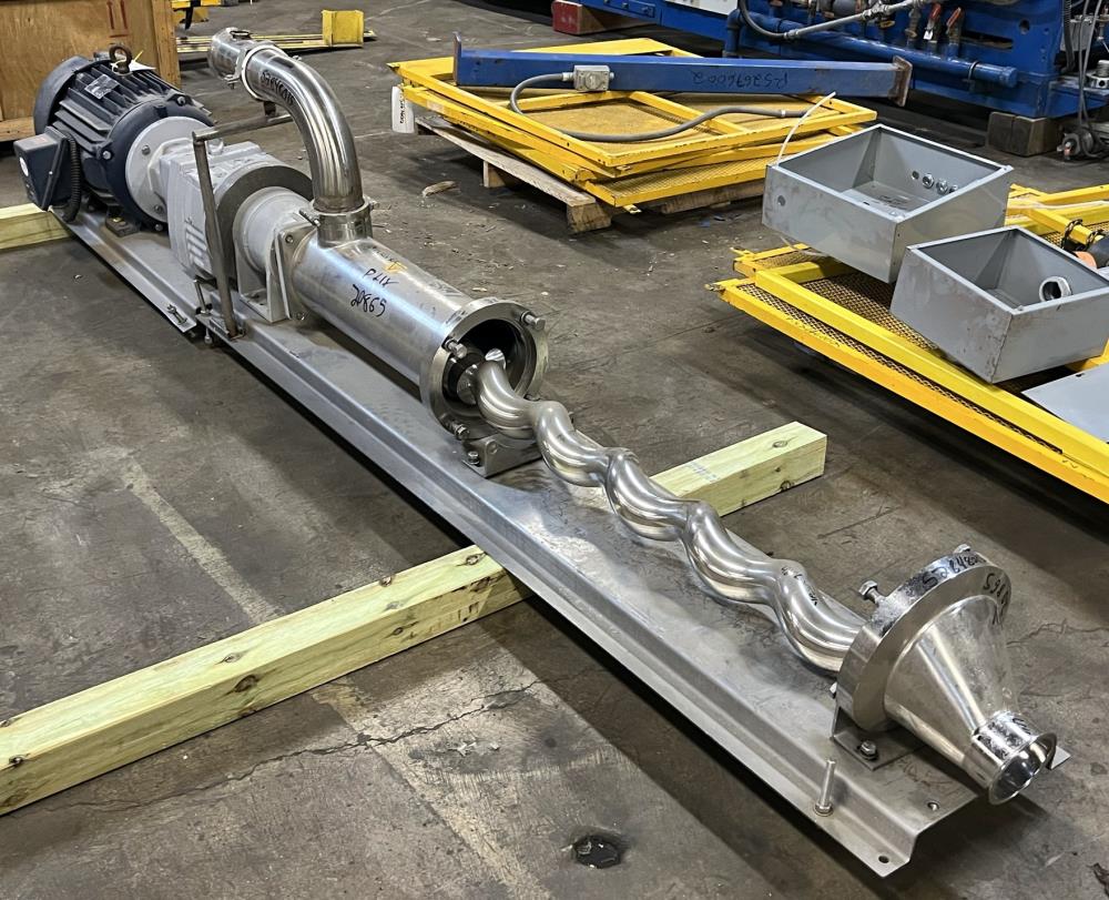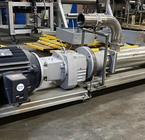 Knoll Model MX5058020 316 S/S Progressive Cavity Pump. Capacity 6,000 GPH. Revolutions 205 rpm. Stator EVEN WALL 80/20. Standard rotor. 42″ long x 5″ diameter screw. Suction housing 4″ tri-clamp, discharge nozzle 4″ tri-clamp, CIP nozzle 3″ tri-clamp. Driven by approximate 22kW, 3/60/230/460 volt motor.