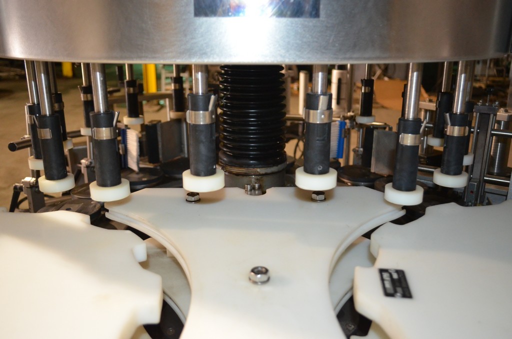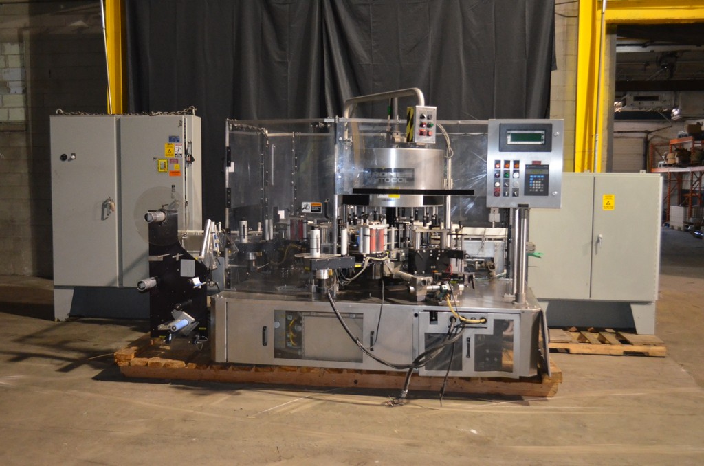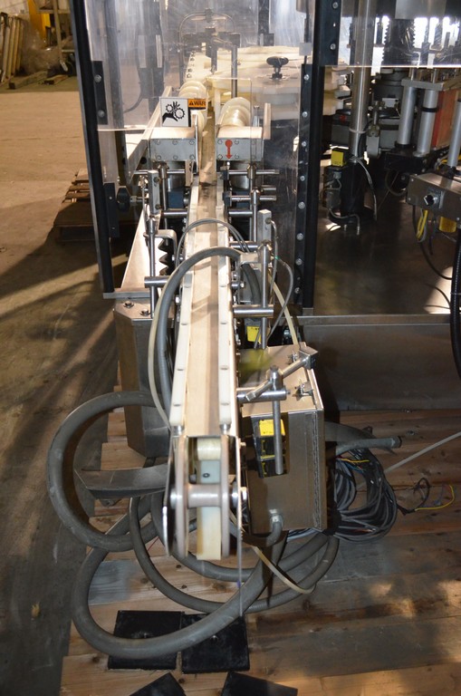 Krones Model Autocol 18 Head Rotary Pressure Sensitive Labeler. Front and Back or Wrap labeler. Max liner width is 6-1/4 in. Vertical label feed assemblies with 18 in roll diameter capacity.18 head turret with 4-1/2 tables on 5 in centers. Allen Bradley SLC 5/03 CPU. Max Label Height: 7 in. Conveyor Length: 131 in. Feed Screw Length: 27-1/2 in and 13-1/2 in. Infeed Star Diameter: 19 in. Infeed Star Number of Pockets: 12. Discharge Star Diameter: 19 in. Discharge Star Number of Pockets: 12. Norwood RS-1000 coder. Print registration. 460V, 3 phase . Two main control cabinets. Two sections off infeed and exit conveyor. Machine Overall Dimensions: 82 in L x 75 in W x 71 in H.
