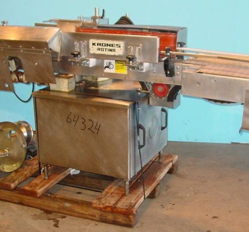 Krones Rotina wrap around cold glue labeler, 12 ft L x 3 1/2 in W delrin conveyor, 32 in L x 7 1/2 in W delrin takeaway conveyor, 26 in l x 6 1/4 in H wrap station belt,Container specs: 2 in min dia, 6 7/8 in max dia,3 1/8 in min container height. Label specs: 2 1/4 in min label length, 14 in max. Screw infeed (5in round and 3in round) 19 in w x 19 in L label magazine, cold glue pump, S/S frame, Apply spot or wrap around labels at speeds up to 100 BPM, Air requirement: 30 PSI, Glass bottles, PET bottles, jars and cans... the Rotina labels virtually any cylindrical container quickly and efficiently, Glue roller 2 7/8 in dia x 6 1/2 in H