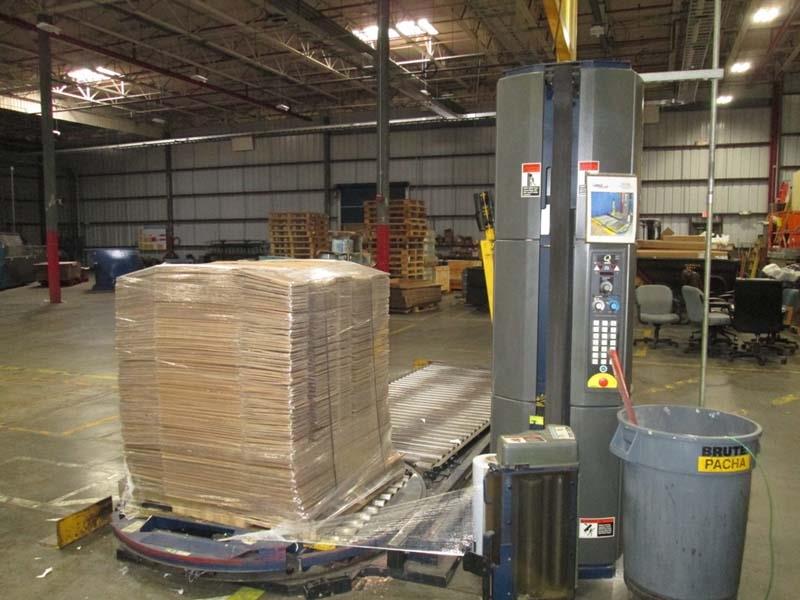 Lantech Model Q300XT Plus Pallet Stretch Wrapper. Production speed up to 30 loads per hour, Standard pallet size 40 x 48 inches, Maximum load height 75 inches, Maximum load weight 4000 lbs. Turntable size 65 inch diameter, Turntable drive motor 1 HP turning 1 to 12 RPM, Film Roll capacity 10 inch roll diameter, 20 inch film web width. Pallet turntable type wrapper, Automatically wraps loads and moves it to the exit conveyor and out of the way for the next load, Eliminates double-handling of load by forklift operator, includes additional pallet conveyor section for discharging wrapped pallet, Machine dimensions 123 L x 135 W x 93 inches high Machine weight 2650 lbs. Electrical 120 Volt, 1 Ph, 60 Hz, 20 Amp