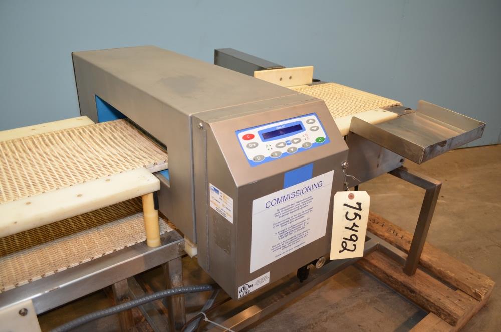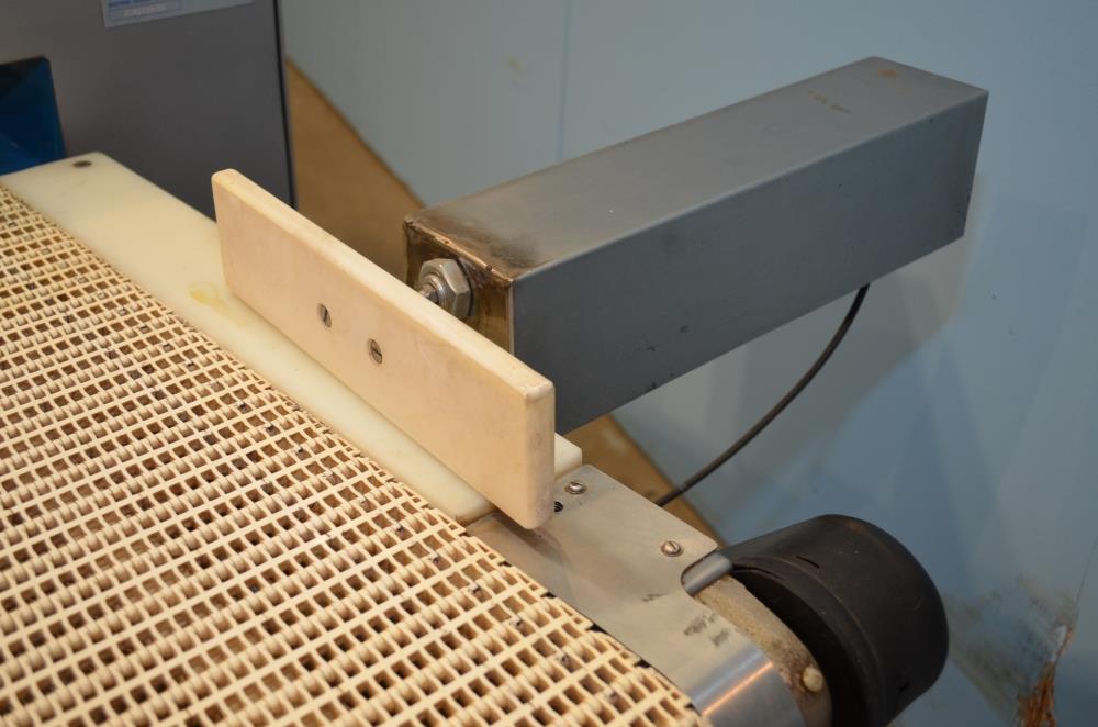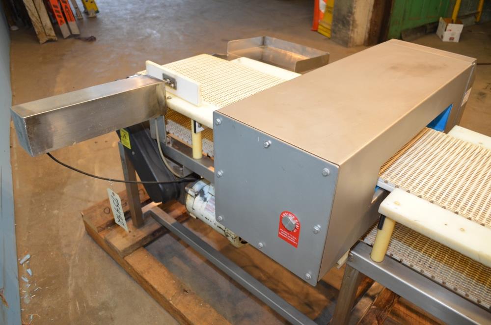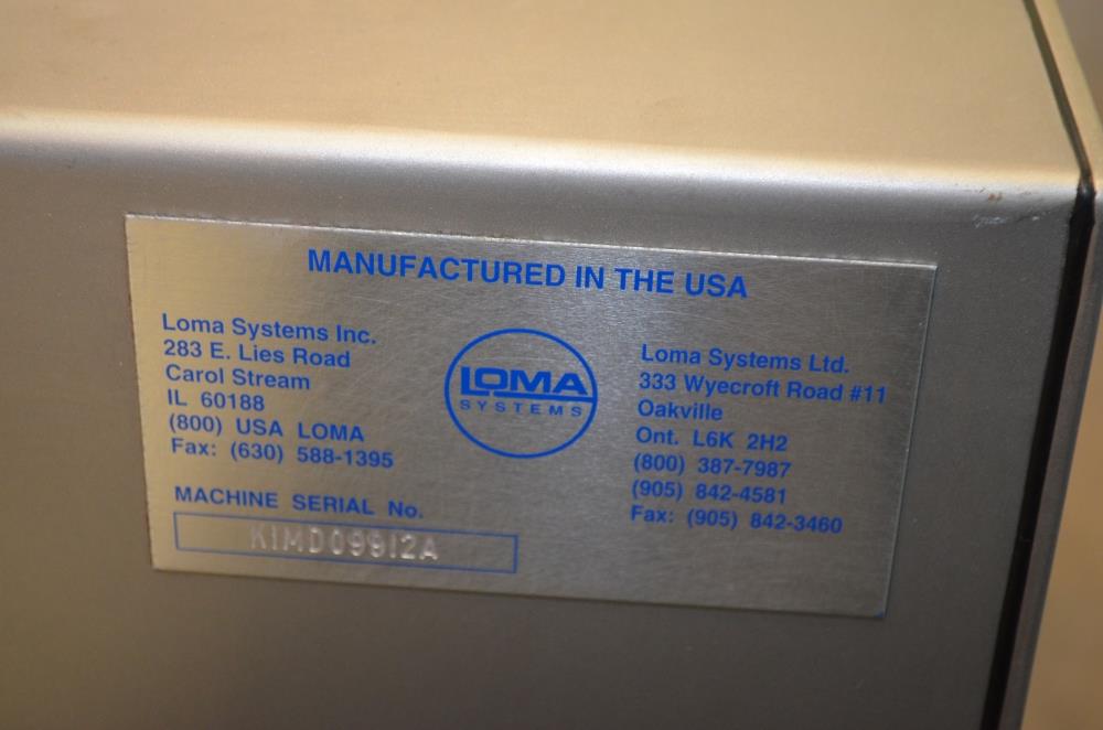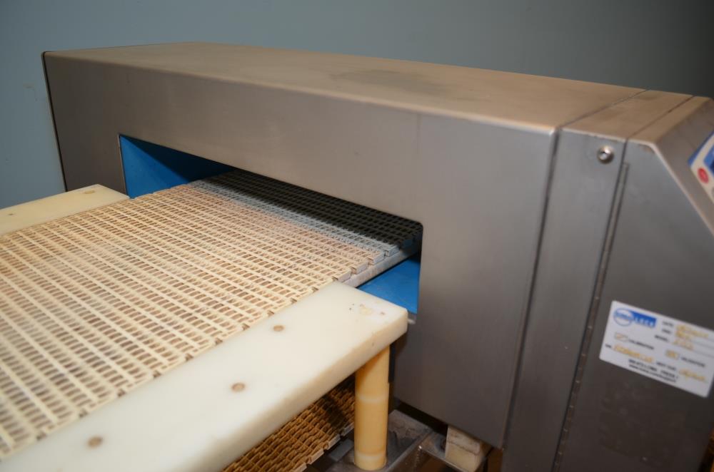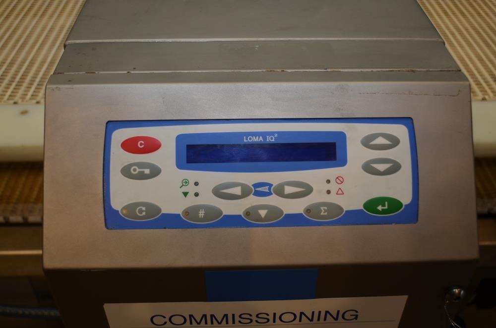 Loma Model IQ2 S/S 14 in W x 3 in H Aperture Metal Detector With Pneumatic Ram Reject. Left to Right Configuration. 14 in W x 3 in H Useable Aperture. 19 3/4 in W x 4 in H Total Aperture. 14 in W x 82 in L Plastic Interlocking Chain Conveyor. Pneumatic Ram Style Reject with 12 in W x 3 in H Pusher. S/S Frame, 26 in Belt Height. Test samples passed: 2.00mm Ferrous, 2.00mm Non-Ferrous, 2.50mm S/S. 120 V, 1 Ph, 60 Hz.