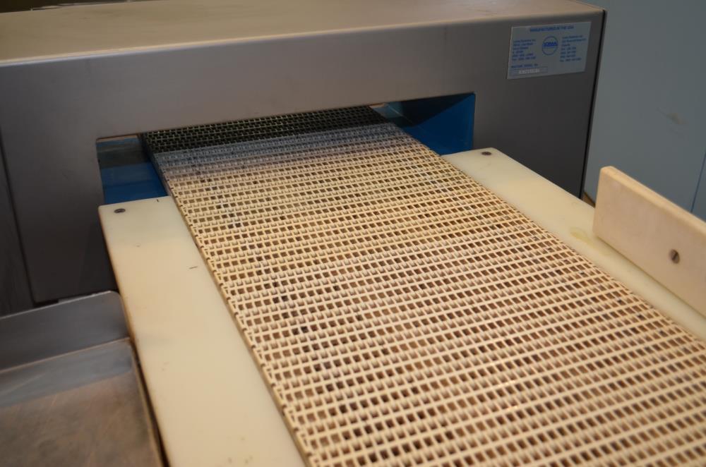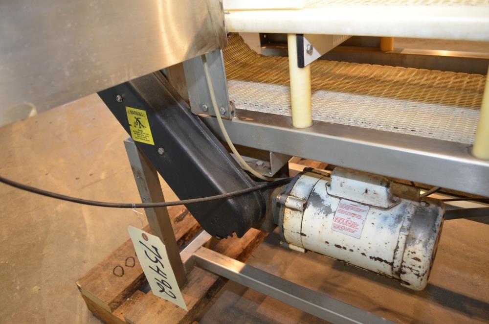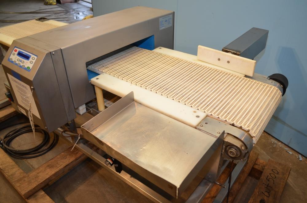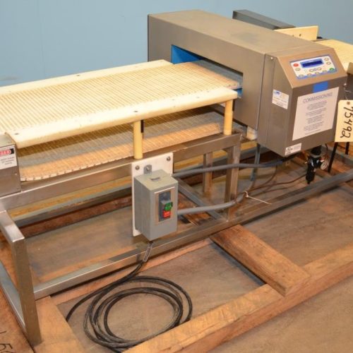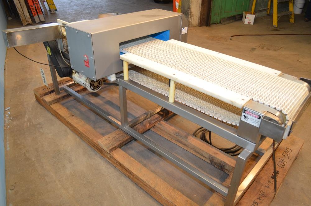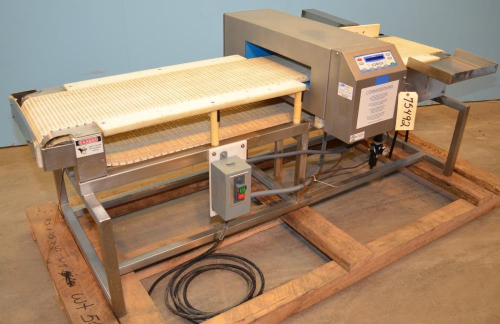 Loma Model IQ2 S/S 14 in W x 3 in H Aperture Metal Detector With Pneumatic Ram Reject. Left to Right Configuration. 14 in W x 3 in H Useable Aperture. 19 3/4 in W x 4 in H Total Aperture. 14 in W x 82 in L Plastic Interlocking Chain Conveyor. Pneumatic Ram Style Reject with 12 in W x 3 in H Pusher. S/S Frame, 26 in Belt Height. Test samples passed: 2.00mm Ferrous, 2.00mm Non-Ferrous, 2.50mm S/S. 120 V, 1 Ph, 60 Hz.