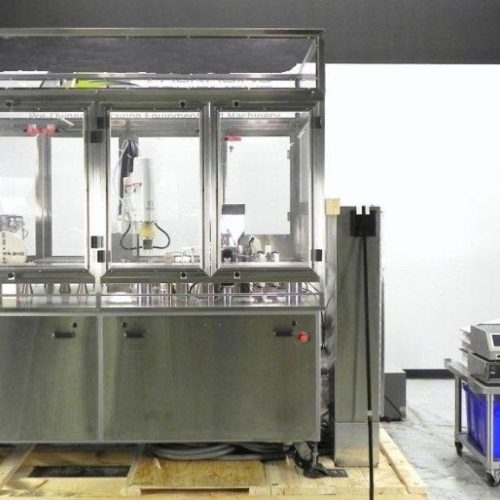 M and O Perry Model SFA1 Complete Vial Cartridge Placer and Filler Assembly System. Machine includes (2) tiltable feed hoppers, (2) stainless steel vibratory feeders, and a stainless steel discharge chute with pneumatic reject arm. Machine has a rotating vial inverter with pneumatic pusher. System is set up with a 6 ft vial conveyor. Has an integrated Yamaha VK600X High Speed Scara articulated robot. Is set up with a 3 position plunging filler station. Also had pneumatic discharge arm with stainless steel discharge system. Has product sensing, (1) IVEK Digispense 800 controller, and (1) Quickpanel Jr Total Control panel. Has all stainless steel hopper with heating coil and a Talboys labratory stirring system with liquid level sensing. Has Allen Bradley SLC 5/03 PLC controls. 1/60/230V.