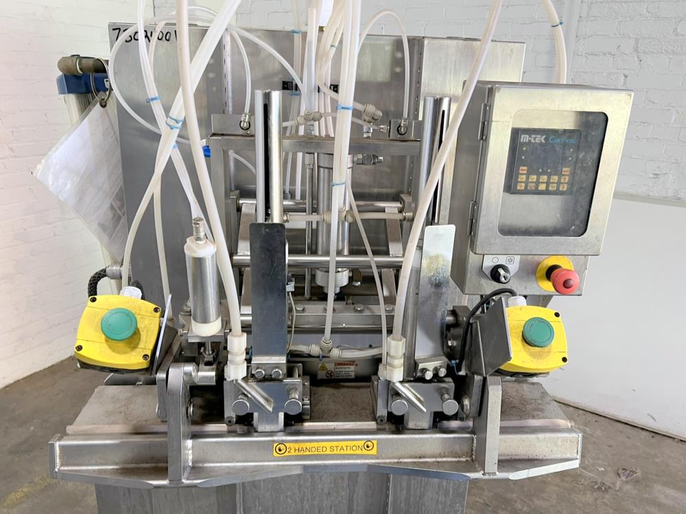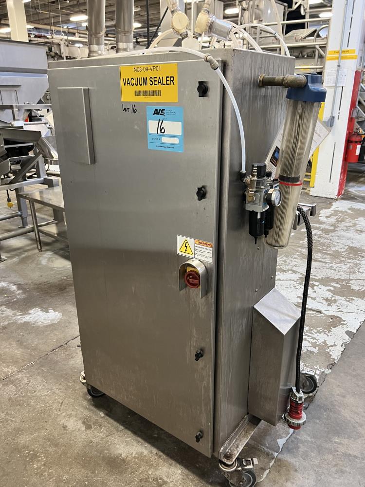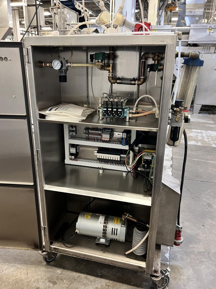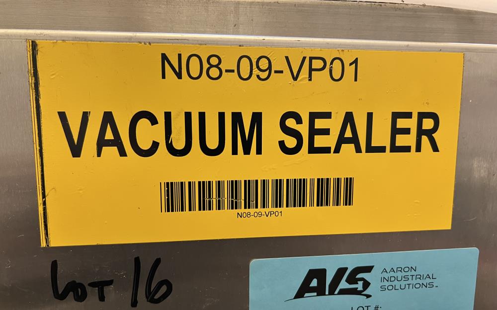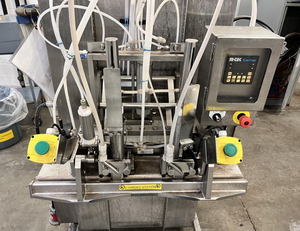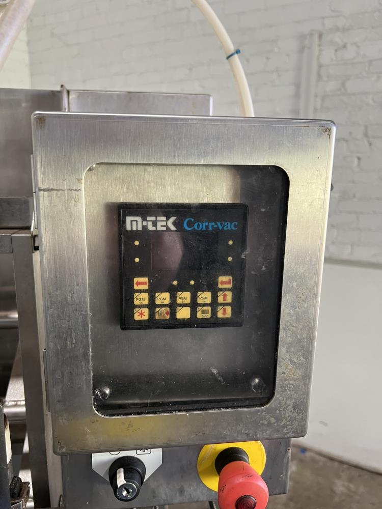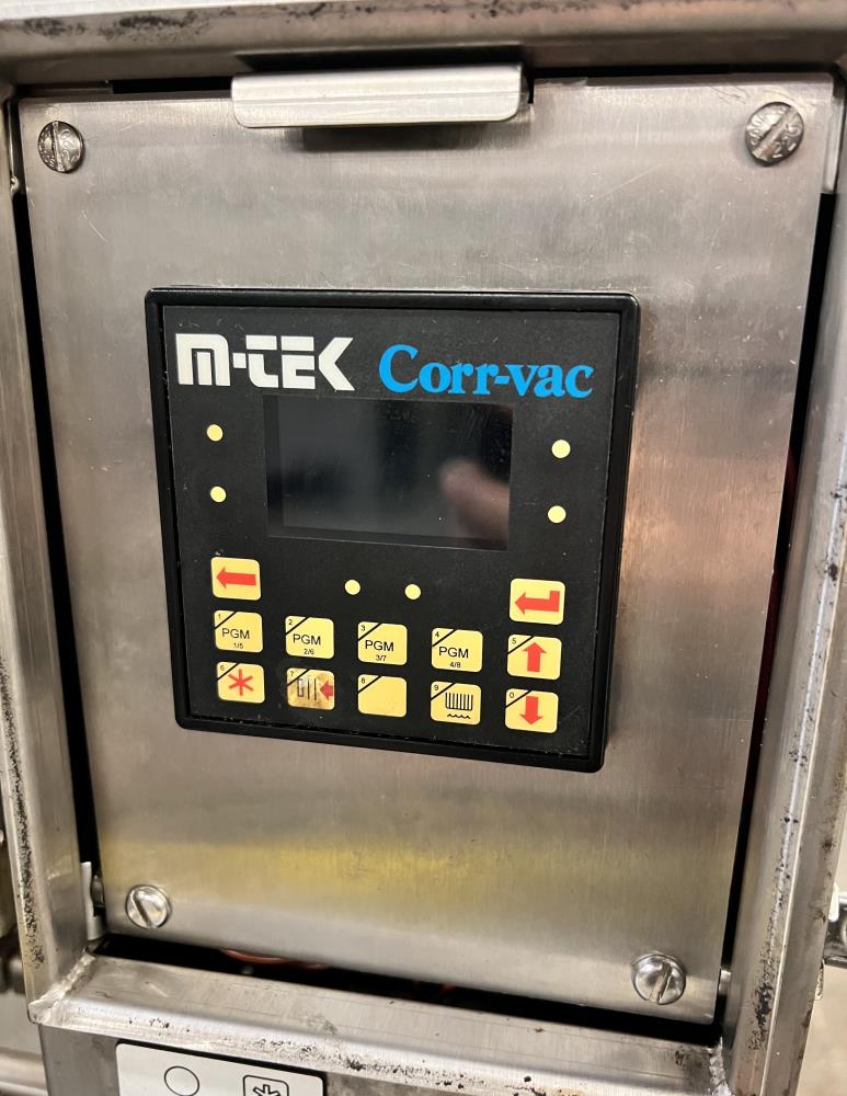 M-Tek Corr-Vac Vacuum Sealer, Model MK III. Approximate 30″ wide seal area. M-Tek controller. Gast model 1023-V103-G278E vacuum pump. Two hand control. Mounted on casters.