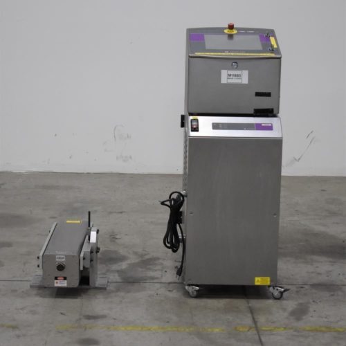 Markem-Imaje Model 7031 Laser Coder. Production line speed maximum 300m/min. Marking speed maximum 1,000 characters/s. Character height 1 to 100mm, no limit on number of text lines. Includes model ES400 laser coder fume extractor.