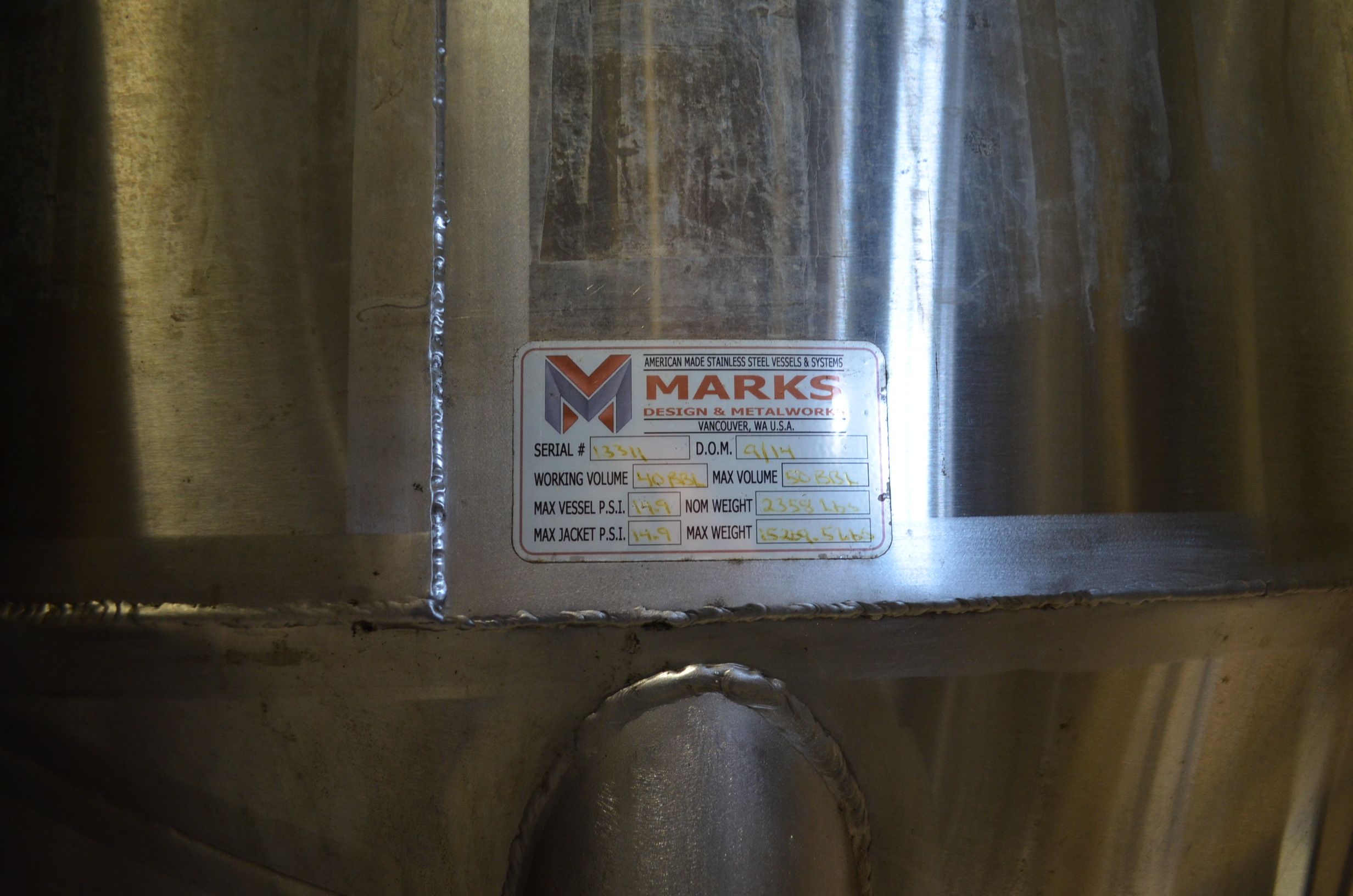 Marks 40 BBL Stainless Steel Vertical Jacketed Cone Bottom Fermentation Tank 2014 S/N 13311