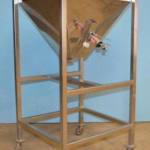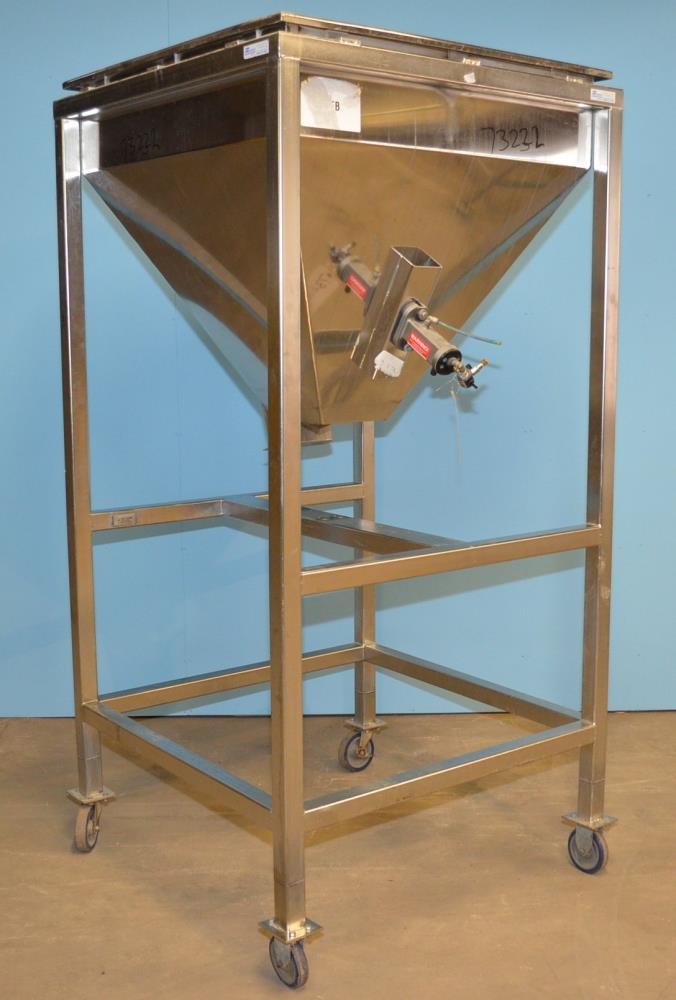Martin Engineering 27 Cu Ft Portable S/S Hopper. 36 in L x 36 in W x 36 in D Interior with Tapered Bottom. 8 1/4 in x 8 1/4 in Discharge. 47 in Discharge Height. Exterior Pneumatic Vibrator. S/S Frame with (4) Legs and Casters.
