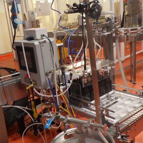 Meheen (4) Head Growler Filling and Capping Line Including: Inverted Four Head Rinser with Tilting Gripper and Labeler, Meheen Four Head Filler and Single Head Manual Capper, Wrap Around Labeler, Air Knife System with Two 5 HP Blowers and Knives, Stainless Steel Conveyor Complete with Two Heat Guns for Shrinking Neck Bands, 36 Inch Poly Turn Table.