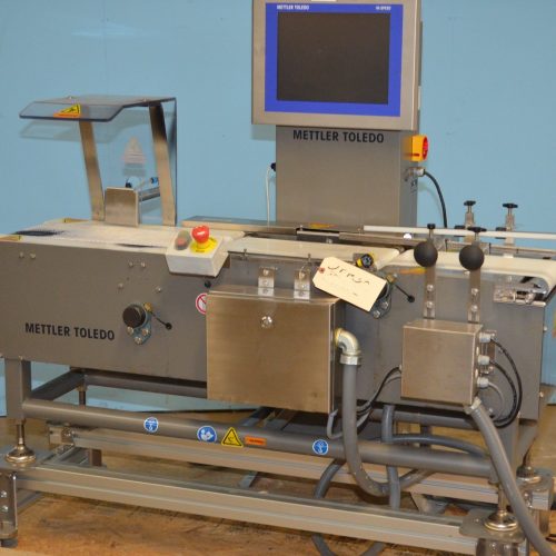 Mettler Toledo Model CM6000XS, 6,000 gram Maximum Weighing Capacity Checkweigher. Right to Left Configuration. Pneumatically Operated Pusher Style Reject with 4 in x 4 in Pusher Plate. 8 in W x 16 1/2 in L Weigh Cell with Flat Vinyl Belt, 8 in W x 15 in L Infeed Section with Flat Vinyl Belt, 8 in W x 21 in L Discharge Section with Plastic Interlocking Chain Belt. S/S and Plastic Contact Parts. C/S Frame. 23 1/2 in Belt Height. 15 in Color Touch Screen HMI. 115 V, 1 Ph, 60 Hz.