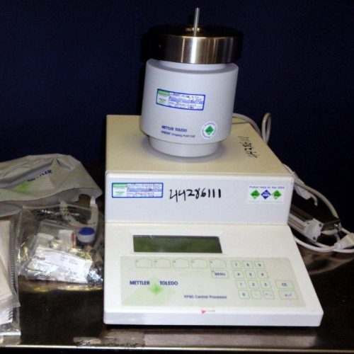 Mettler Toledo Model FP83HT Dropping Point Cell. Determines dropping and softening points fully automatically. A wide application range comprises, for instance, the characterization of lubricant greases, edible fats, suppositories, cosmetic products, waxes and parafines. Special sample cups and methods guarantee compliance with standard methods as the ASTM methods for the softening point determinations of asphalt, pitch or resins. Includes a FP90 Central Processor, serial# 5122328299.