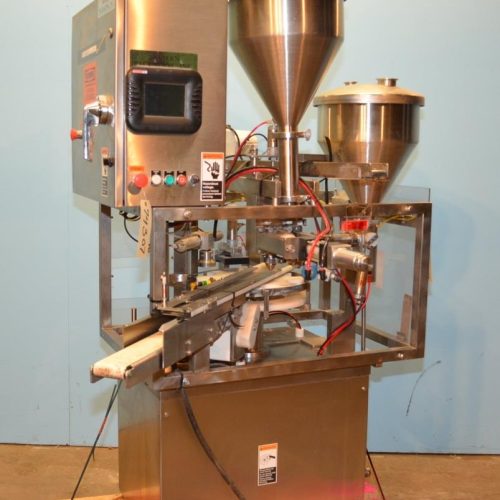Modern Packaging Model SR8DC Twin Head Automatic Stainless Steel Rotary Cup Filling and Overcapping Machine. Filling Speed of Approx. 25 Cups Per Minute. Filling Capacity 1/2 oz up to 14 oz. (8) Position Rotary Turret with 2 3/4 in W Openings. (2) Pneumatically Operated Filling Heads. (1) S/S Filling Head with Approx. 5/8 in Diameter S/S Nozzle, 14 in Diameter x 18 in Deep S/S Hopper with S/S Solid Lift Off Cover. (1) S/S Filling Head with Approx. 1 in Diameter Nozzle, 14 in Diameter x 18 in Deep S/S Hopper with S/S Lift Off Cover with (1) 1 1/2 in Diameter and (1) 2 1/2 in Diameter Inlets. 36 in L x 3 3/4 in W S/S Overcap Cap Chute. Single Head Pneumatic Rotary Applicator For Overcaps. 3 in W x 30 in L Flat Belt Infeed and Discharge Conveyors. AVG EZ-Series Digital Touch HMI with Allen Bradley Microligix 1200 PLC. S/S Frame with Casters. 230 V, 3 Ph, 60 Hz. Inlet Air Pressure Approx. 80PSI. Air Requirement 12 CFM at 100 PSI. 230 V, 3 Ph, 60 Hz.