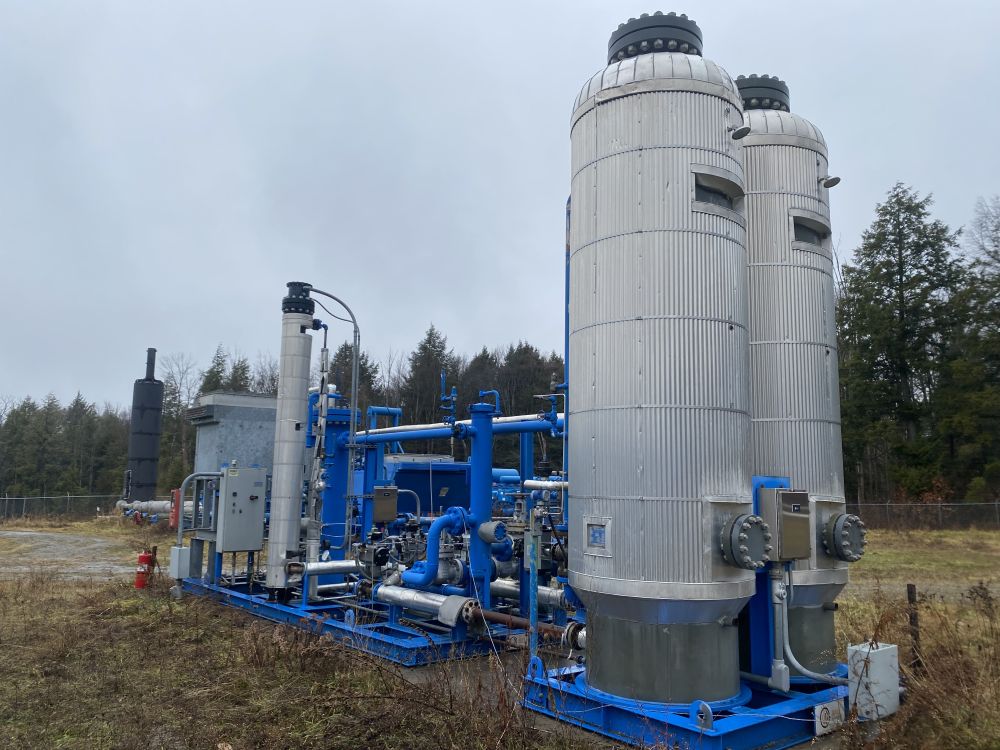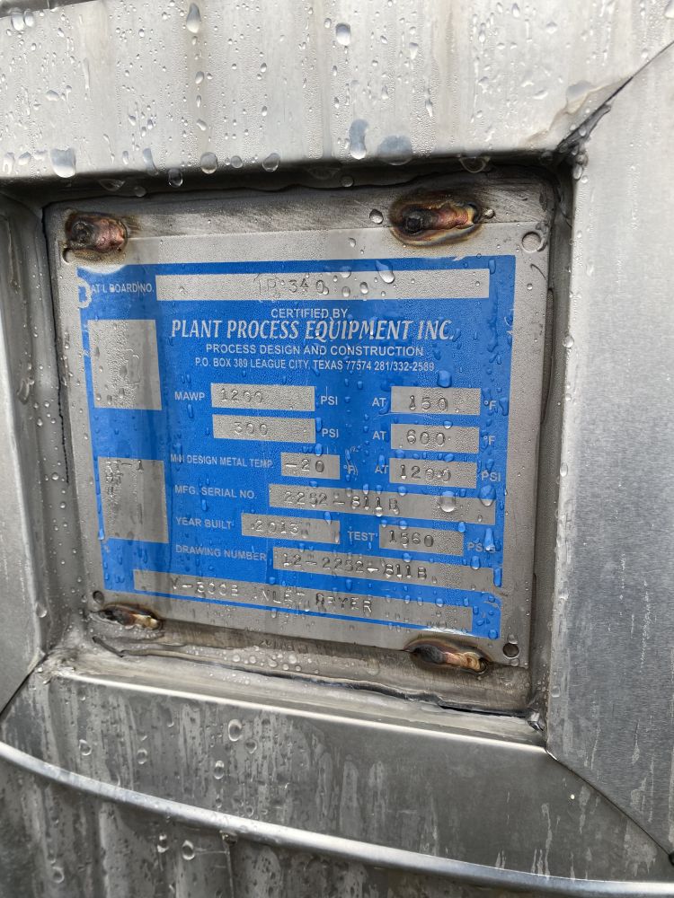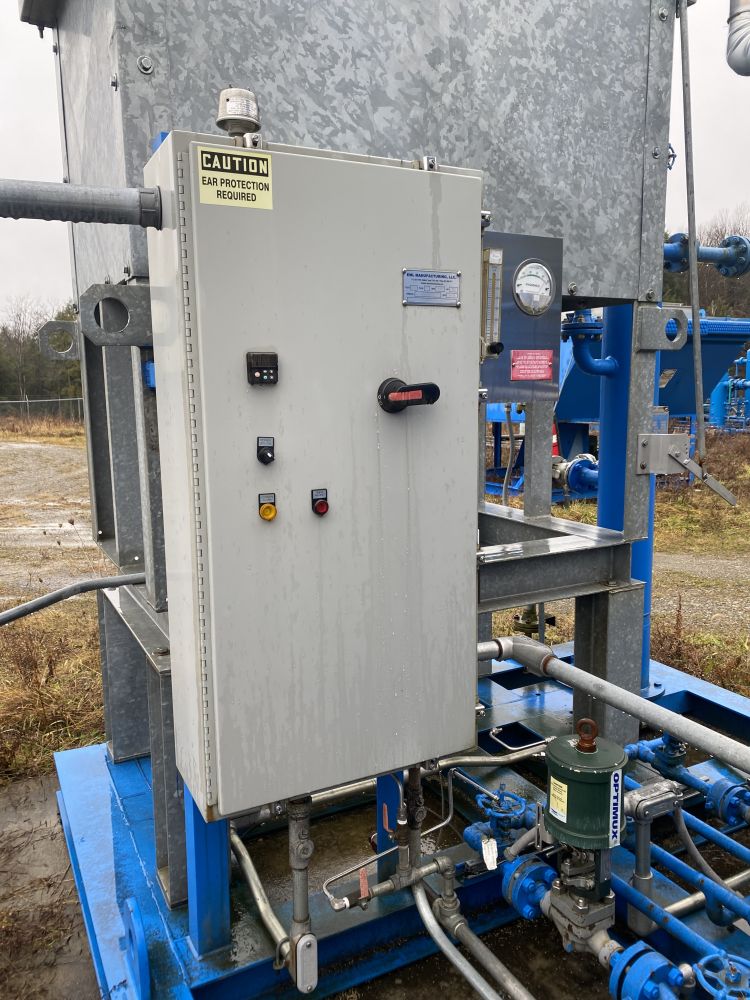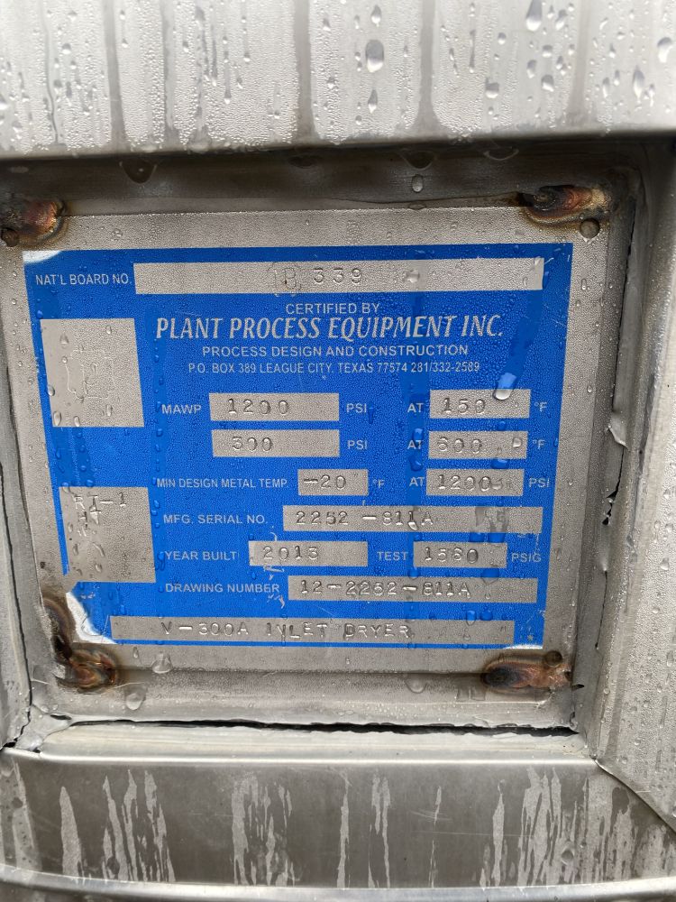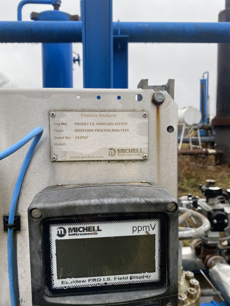 Mol Sieve Dryer Skid. 15,000 MCFD at ≤ 10 lbs/MMSCF water inlet for < 1 PPM water outlet. Inlet Coalescer: 16” x 7’6”, 1200 PSIG. Inlet Dryers: 42” x 11’6”, 1200 PSIG, On skid PLC controlled 120 kW regeneration gas heater. 10 Micron dust filter, 1200 PSIG. Regeneration gas cooler and separator, 301 MBTU/HR, 250 PSIG. Optimux 4 20 mA controllers, Rosemount guided wave level transmitters, Foxboro pressure and flowtransmitters. Electronic controlled, pneumatically operated AE switching valves with status feedback.