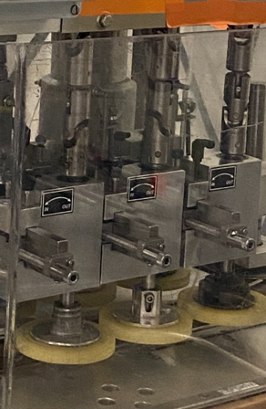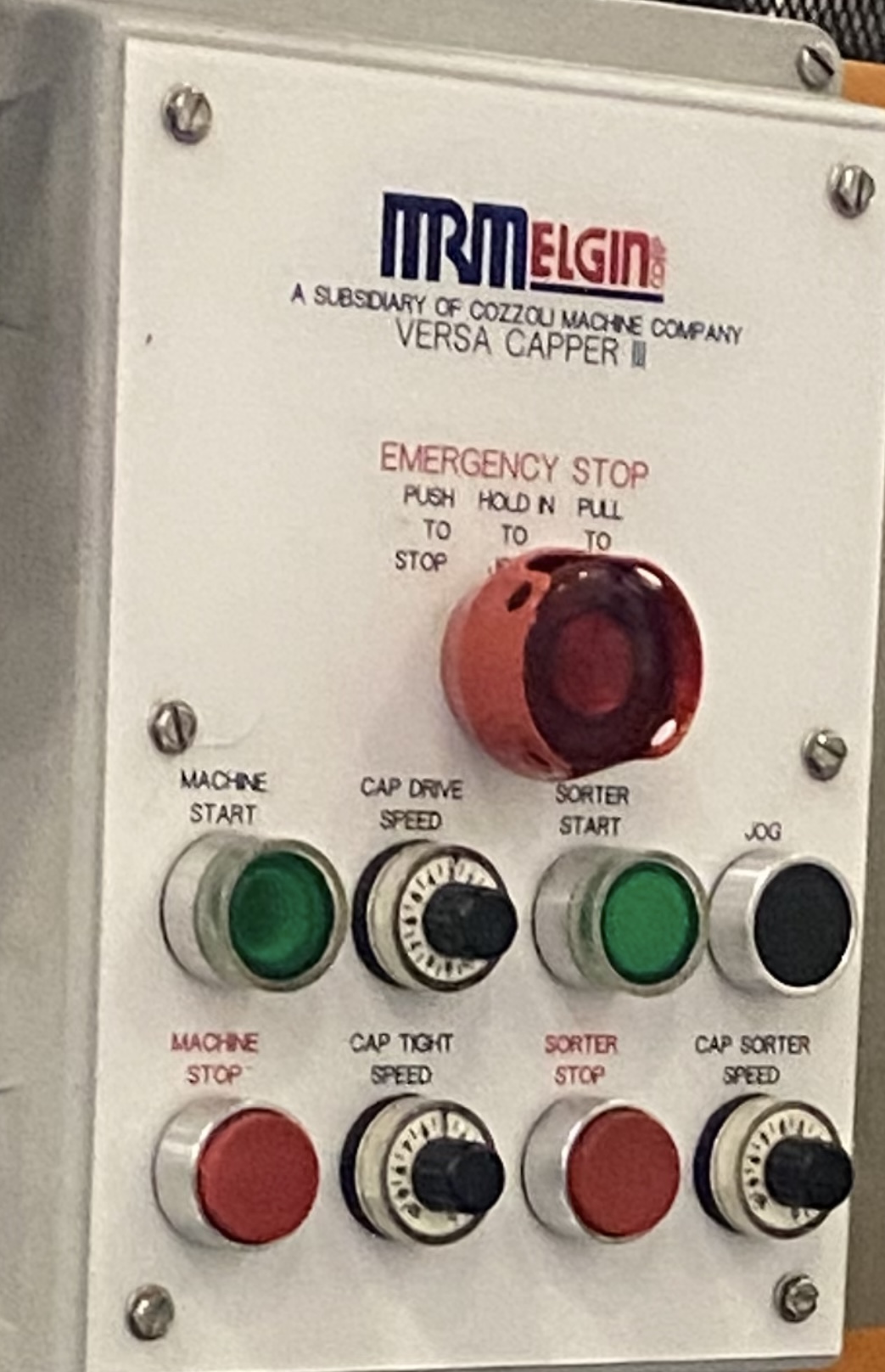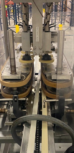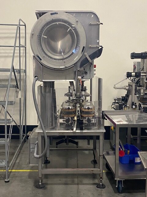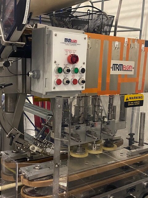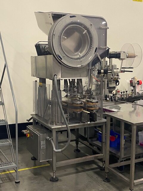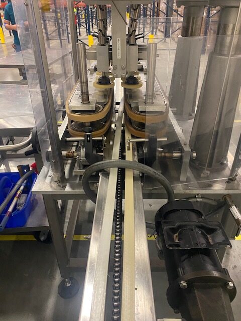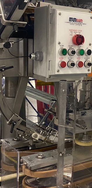 MRM Elgin Model Versacapper III (6) Quill Inline Spindle Capper with Cap Sorter and Cap Chute, Two-Tier Dual Side Gripper Belts, Rated up to 150 Caps per Minute. 230 V 3 Ph, 60 Hz.