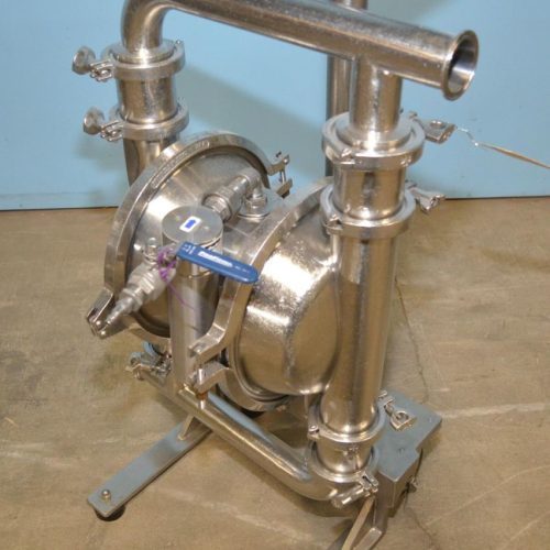 Murzan Model PI50DL1B S/S Diaphragm Pump. 8 in Diameter Chambers. 1 3/4 in Diameter Tri-Clamp Inlet and Outlet. Self Priming up to 24 Feet. Viscosities up to 150,000 CP. Specifically Designed To Meet The Special Requirements Of The Sanitary Industry. High Efficiency Oil Free Air Valve, Maintenance Free Check Valve Systems, And Total Visual Inspection Of All Wetted Parts Give The User A Safe And Efficient Transfer Of Foods, Cosmetics And Pharmaceuticals. USDA Listed, FDA Approved, The PI 50 Series Is Manufactured To Meet General 3-A Standards.