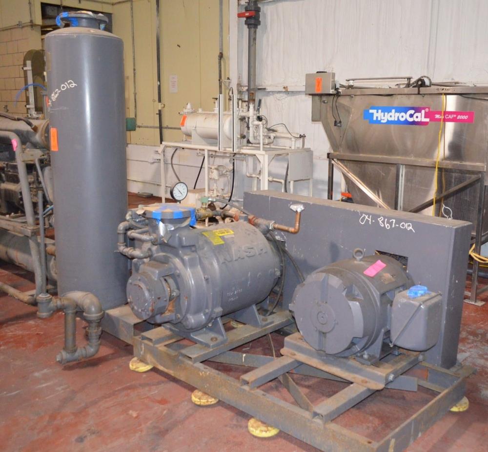 Nash Model SC7 75 HP Liquid Ring Vacuum Pump. Carbon Steel Construction, Rated 880 RPM, POS 4, On Base With Separator, 75 HP Drive Motor, Belt Driven, 230/460 Volts.