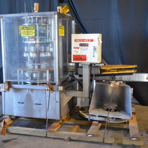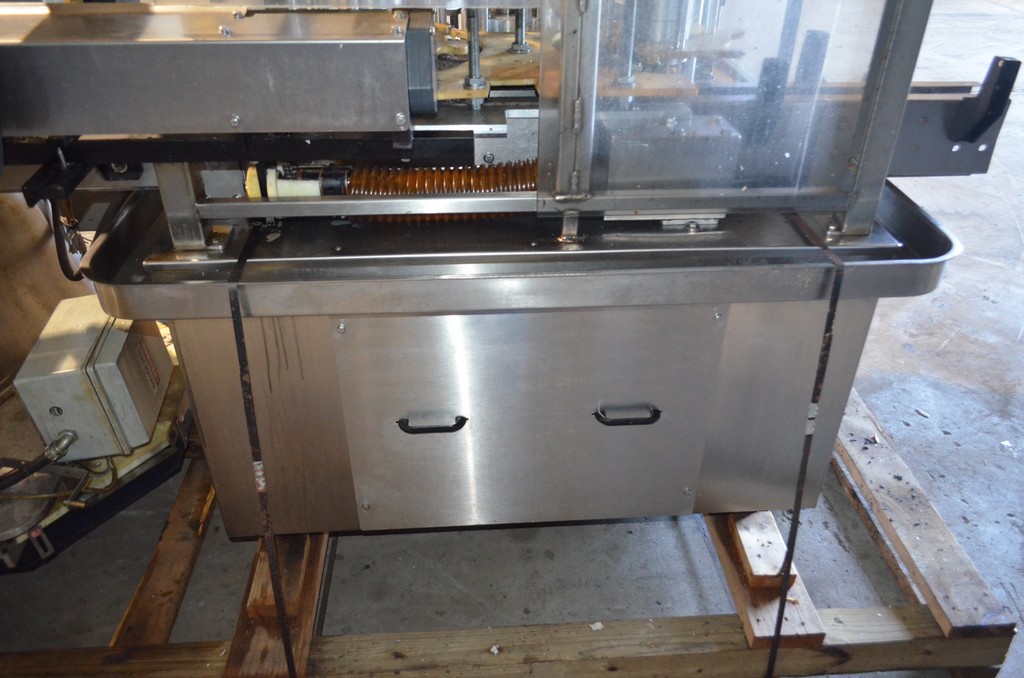 Pack West Model Royal-8 (8) Head Rotary Screw Capper. Stainless steel construction. 8 Heads on 8 in Chuck Centers. Full safety enclosure. Integrated 24 in vertical sorter. Fully adjustable cap chute. Upgraded Morrison dual infeed timing screw kit. Infeed Star Diameter: 15 in. Infeed Star Number of Pockets: 6. Discharge Star Diameter: 15 in. Discharge Star Number of Pockets: 8. 21 in Centerline between infeed/discharge stars. Feed screw Length: 35 in. Surrounding spill gutter. 120 in Conveyor. Previously ran an F-Style oil quart, 28 mm cap. Utilities: 230/460 V, 60 Hz, 3 Ph. Overall Dimensions: 53-1/2 in L x 50 in W x 79 in H