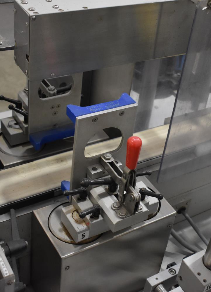 PagoMat System Model 200/157 Font and Back Pressure Sensitive Labeler with Redundant Heads. Approximate label size width: 15mm include liner to 220mm include liner max. Has top hold down, large label heads for tall containers. (2) Front and (2) back label heads. Allen Bradley PB-3 PLC. Allen Bradley PanelView Plus 700 HMI. 5-1/2 in max reel. 3-1/2 in Wide conveyor. Last used in powders packaging operation on square containers. 480 V, 3 Ph, 60 Hz.