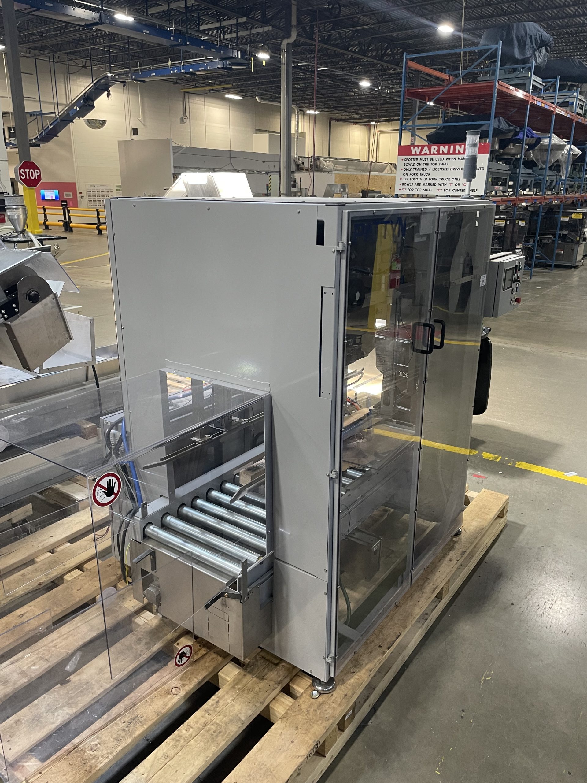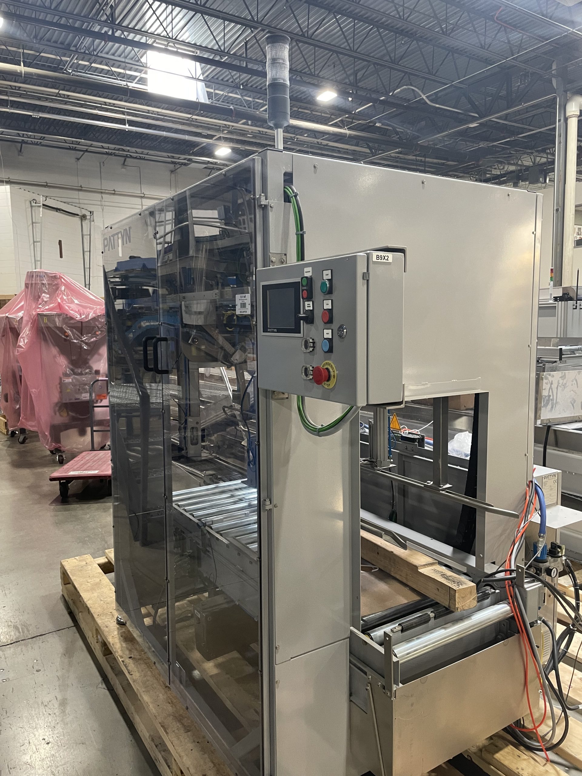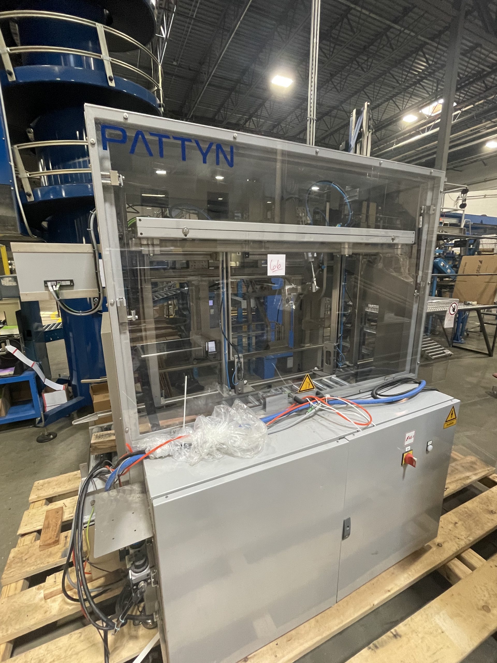 Pattyn Model DF11 Bag Decuffer Folder. Decuffs, Regussets, and Closes the Bag by Folding. Up to 15 CPM. Case Sizes 12 in L x 8 in W x 5 in H Minimum, 25.5 in L x 16 in W x 25.5 in H Maximum. PE, LDPE, HDPE Type Film From 0.4 mil Thickness.