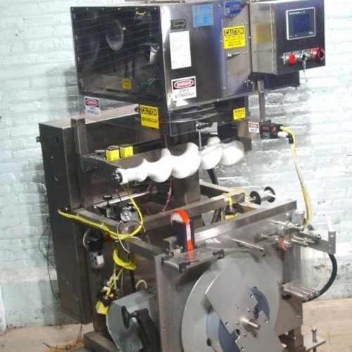 PDC Mdl 50E Neck Bander, Speed: 50 to 130 CPM, Band dia range: .375 in to 3 in, band height range: .625 in to 7 in, 1 HP single phase 480 volt, Quick panel Jr conrols, 24 in L container feed screw ( last used for 44 oz container, Bullet change part for 74mm), S/S frame, Film registration eye. PDC's 50 Series is appropriate for moderate speed shrink sleeve labeling applications with a maximum speed of 130 containers per minute (cpm).