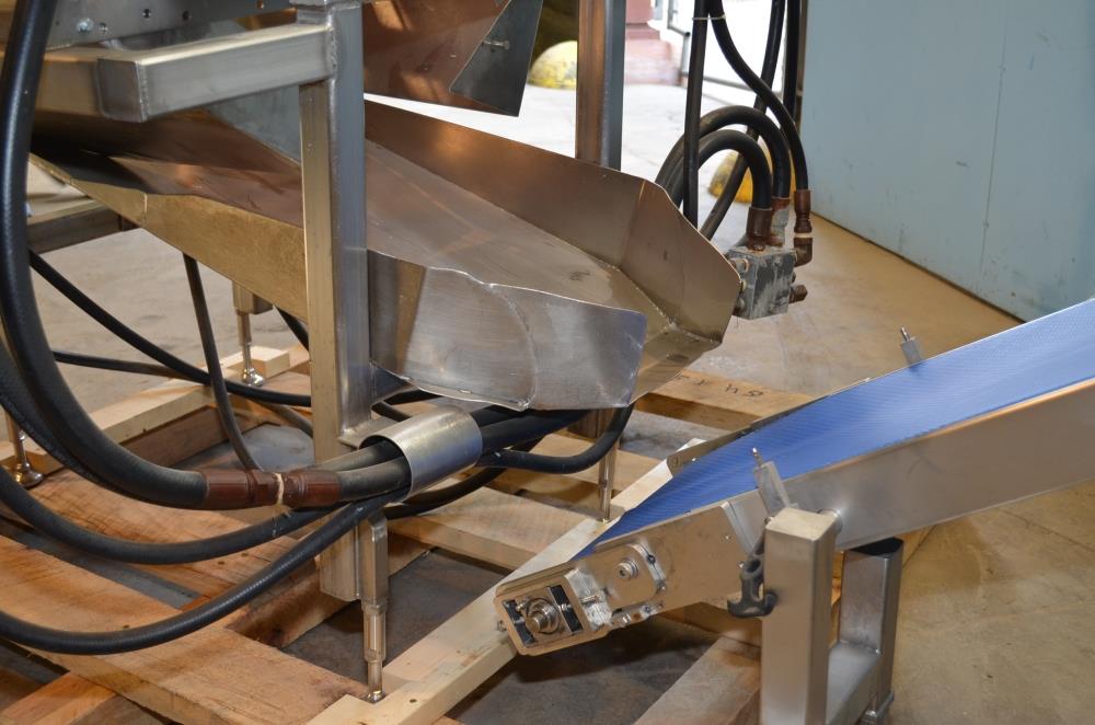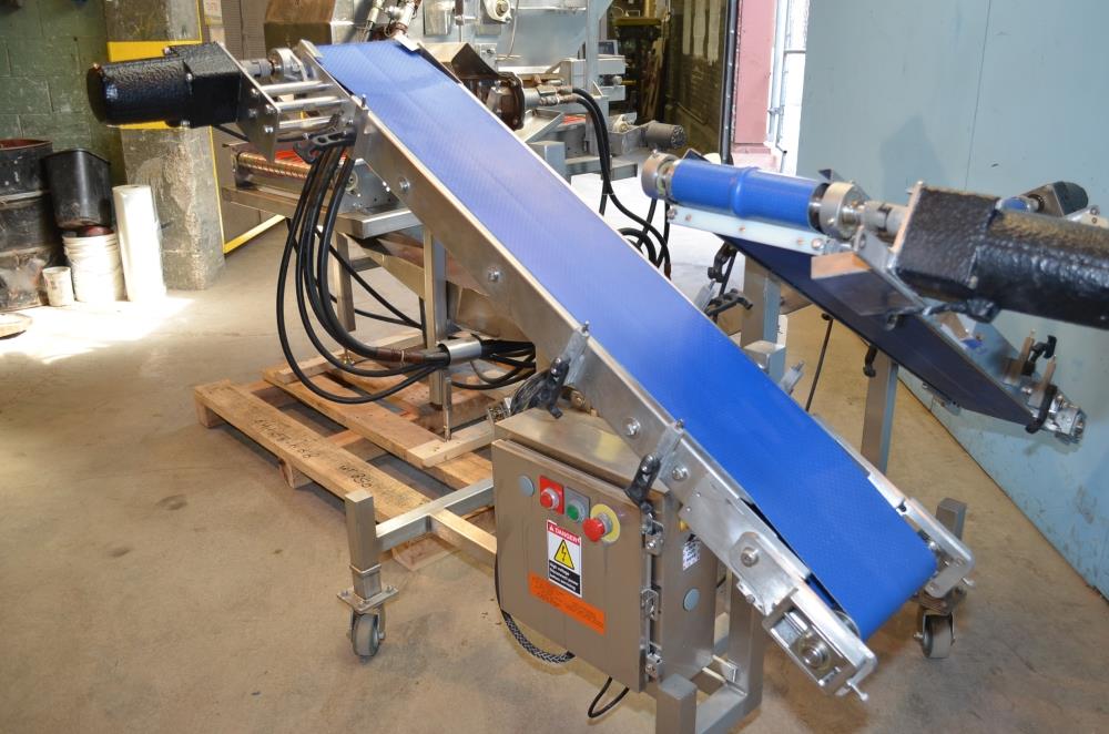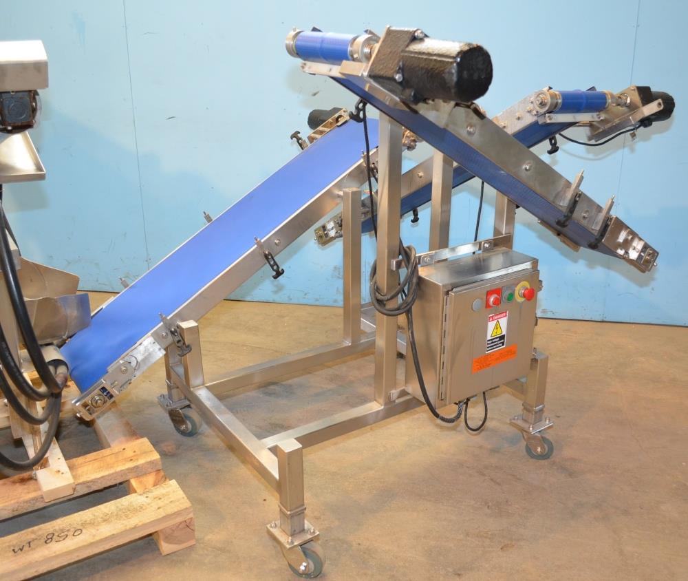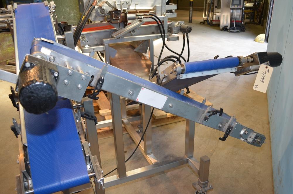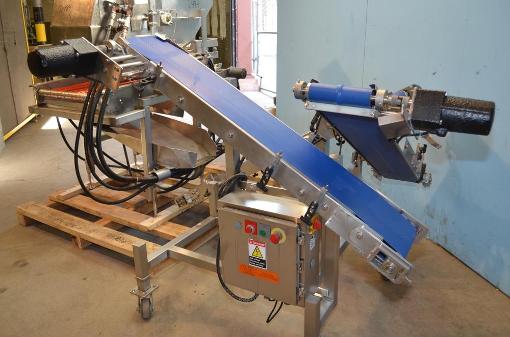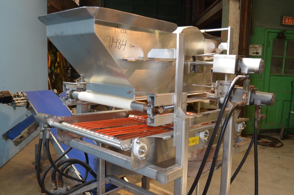 Pizzamatic S/S Waterfall Type Cheese and Topping Applicator with Banjo Belt Conveyor. 24 in W x 48 in L Pass Through Area with 13.5 in W Banjo Belt Conveyor, 15.5 in W x 14.5 in D Topping Feed Hopper, 17 3/4 in W x 30 in L Conveyor Underneath Topping Hopper, (8) 15 in W S/S Rakes For Applying Topping, 18.5 in W S/S Excess Product Catch Chute. With Pizzamatic Model RC500 Recirculation Return Conveyor System Consisting of Three Incline Conveyors on Common Frame. Infeed Height 20 in, (1) 14.5 in W x 48 in L Belt, (1) 8.5 in W x 54 in L Belt, (1) 8.5 in W x 52 in L Belt, Discharge Height 56 in, Vinyl Belts, Electric Drives, S/S Frame with Casters, 240 V, 3 Ph, 60 Hz.