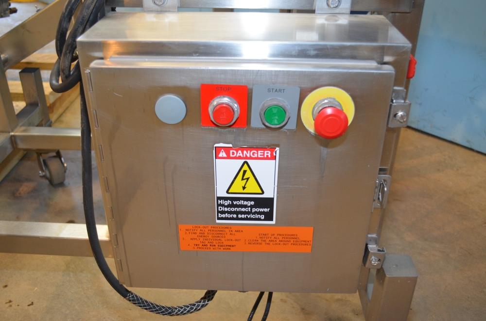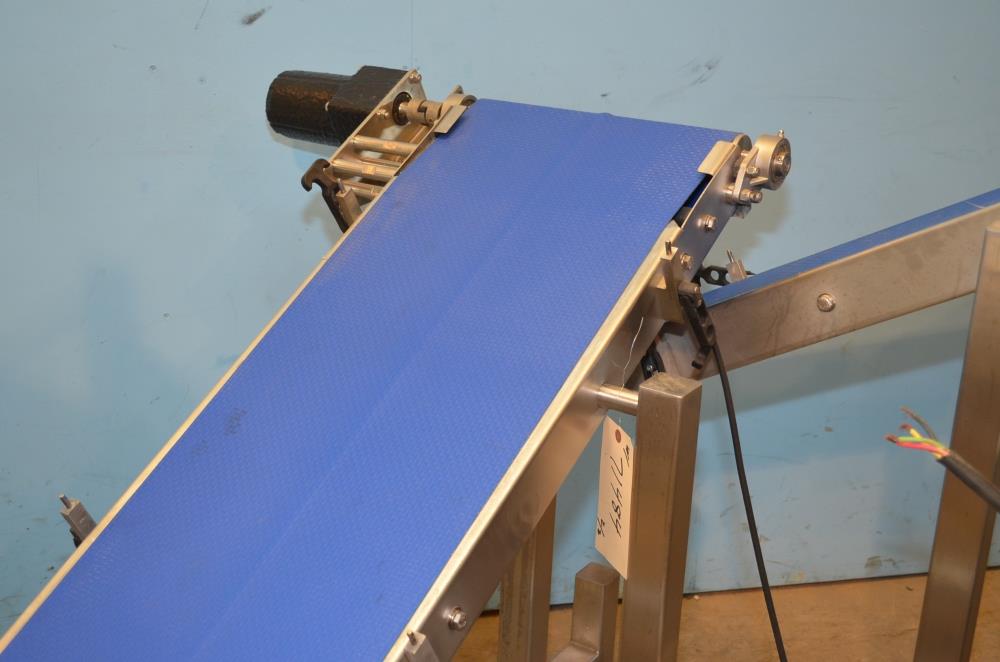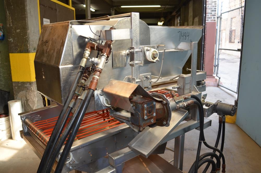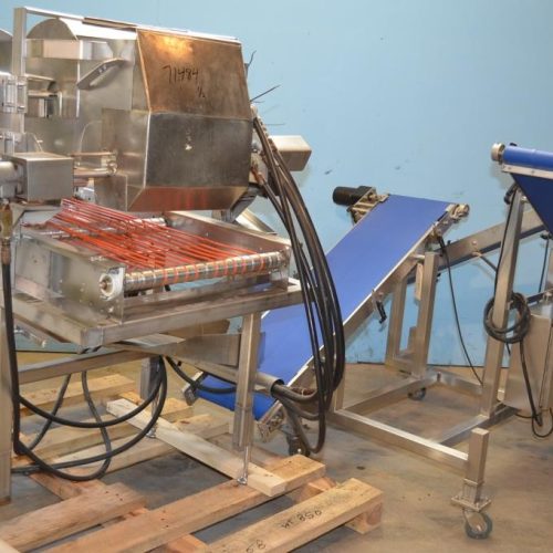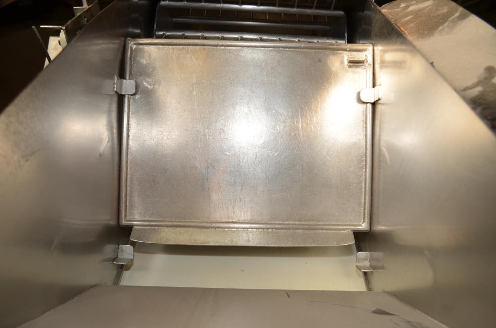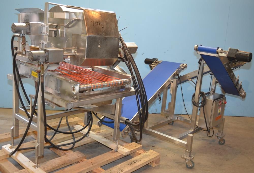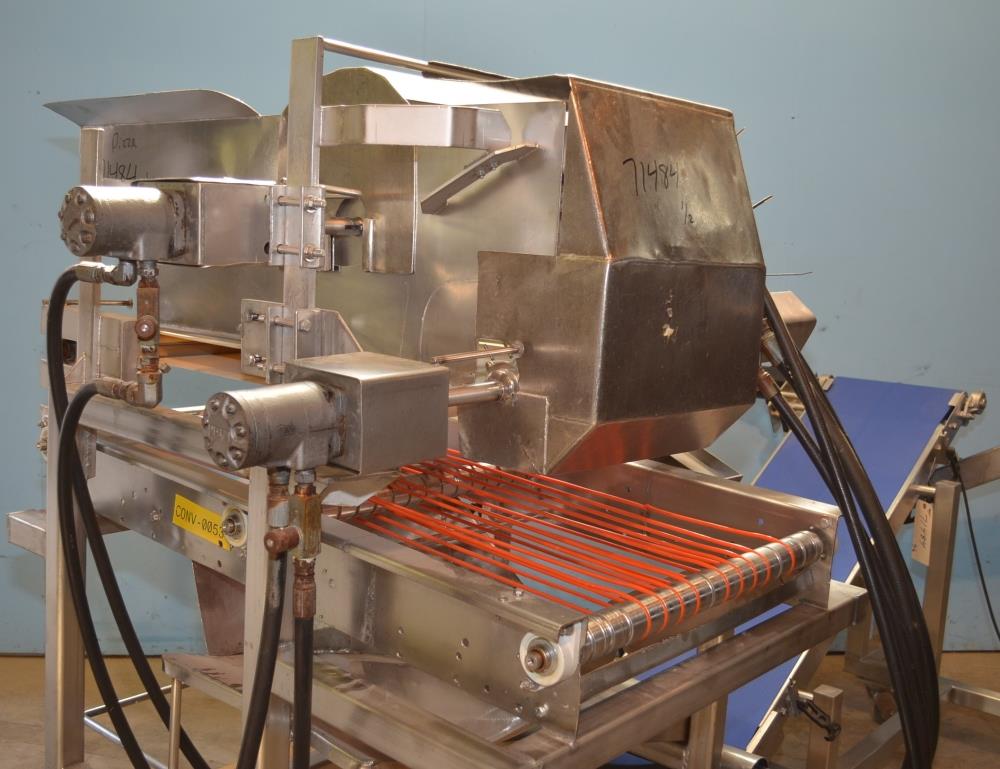 Pizzamatic S/S Waterfall Type Cheese and Topping Applicator with Banjo Belt Conveyor. 24 in W x 48 in L Pass Through Area with 13.5 in W Banjo Belt Conveyor, 15.5 in W x 14.5 in D Topping Feed Hopper, 17 3/4 in W x 30 in L Conveyor Underneath Topping Hopper, (8) 15 in W S/S Rakes For Applying Topping, 18.5 in W S/S Excess Product Catch Chute. With Pizzamatic Model RC500 Recirculation Return Conveyor System Consisting of Three Incline Conveyors on Common Frame. Infeed Height 20 in, (1) 14.5 in W x 48 in L Belt, (1) 8.5 in W x 54 in L Belt, (1) 8.5 in W x 52 in L Belt, Discharge Height 56 in, Vinyl Belts, Electric Drives, S/S Frame with Casters, 240 V, 3 Ph, 60 Hz.