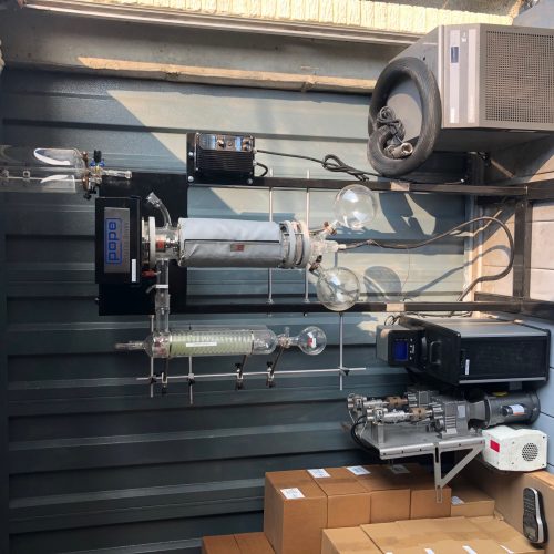 Pope Scientific Model 4040402 4 in Diameter Wiped Film Distillation System. Surface Area 1.16 Sq Ft. Typical Flow Rates 1-20 Liters Per Hour. With Molecular Still with Variable Speed Drive Mechanism (wetted parts 316 S/S) , Self Supporting Still Stand, Glass Jacketed Still Body with Removable Fiberglass Insulating Mantle, Glass Internal Condenser, 2 L Glass Distillate Receiver Flask, Glass Cold Trap, 316 S/S Wiper Retainer, Teflon Wiper Blades, (2) Liquiflo Model 35FS66EEW000009 Pumps, Pfeiffer Model AM739326 Vacuum Pump. Polyscience Chiller, Polyscience Model 1157 Condenser, Polyscience Model P80NHA101B Cold Trap. 120 V, 1 Ph, 60 Hz.