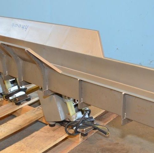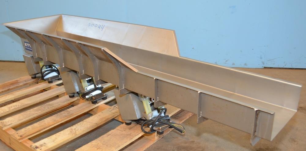 PPM Technologies 18 in W x 66 in L S/S Vibratory Conveyor. 42 in L x 18 in W x 8 in H Infeed Section, 24 in L x 10 1/2 in W x 4 in H Discharge Section. Has (3) F M C Technologies Syntron Model BF2A Electromagnetic Vibratory Motors. 230 V, 1 Ph, 60 Hz.