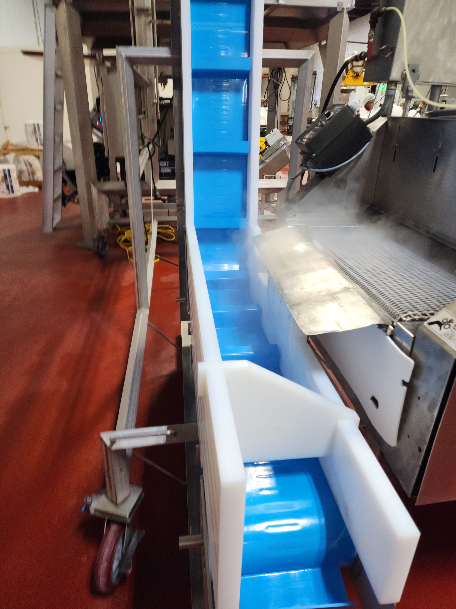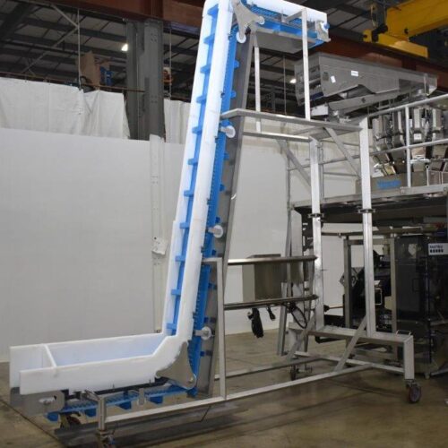 PPM Cleated Incline Elevator with Interalox Belting, 3 in H Scooped Flights on 11.75 in Centers, 9 3/4 in W. With Vibratory Infeed Conveyor.