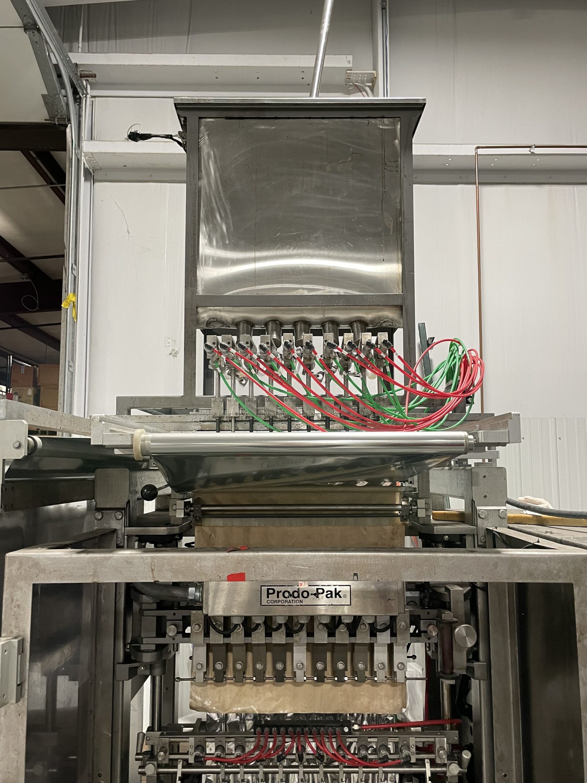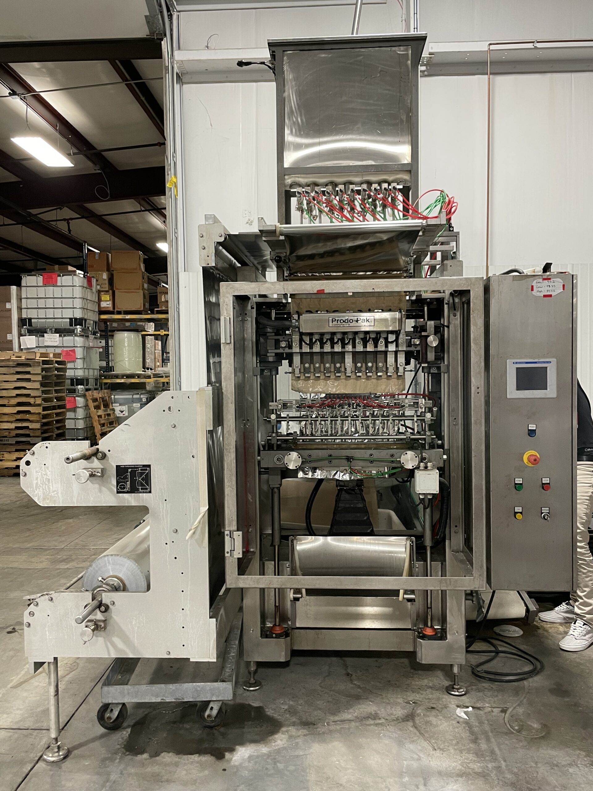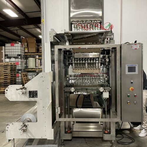 ProdoPak Model PV215CSW10 (10) Lane Vertical Form Fill and Seal Stick-Pack Machine. Approximately 20 Gallon S/S Product Supply Hopper with Cover, Fill Level Sensors, Metering Pump. Allen Bradley PLC, S/S Control Cabinet, Etc.