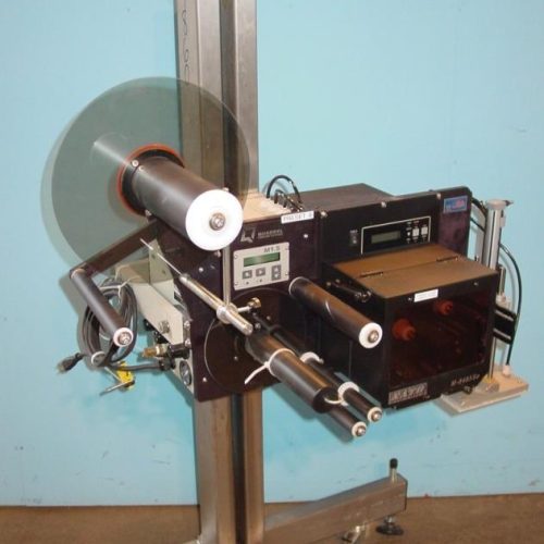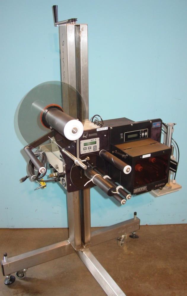 Quadrel Model Q31 Tamp style print and apply Labeler with 6 1/2in L x 4in W tamp pad. Label capacity: 7in W, 12in OD, 3in ID core. Microprocessor controled with LED interface, continuous duty rewind motor and 12in aluminum side plated construction, permanently lubricated sealed bearings, 3/4in bore linear slide air cylinder and quick disconnect pneumatics. PLC compatible. Photoelectric label sensing and product detection. 115/230 VAC, 10 Amp, 50/60 Hz, 70 PSI @ 5CFM. With SATO model M-8485Se (S/N 01204033) print engine using 32-bit microprocessor technology, along with 16 MB of standard RAM and 2MB standard flash. Max print speed of 12 ips, multiple interface options, Thermal transfer/direct thermal print method, 203 dpi print resolution, Media size: max 5.27in W, minimum 1in w x .24in L, Ribbon size 5.25in W x 1968ft L, minimum 1.6in W. 14 pin external connector, 12 proportional bitmap mono-spaced and outline fonts, Windows 95, 98, ME, NT4.0, 2000, XP. Mounted on S/S portable adjustable T-stand up to 55in H.