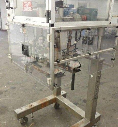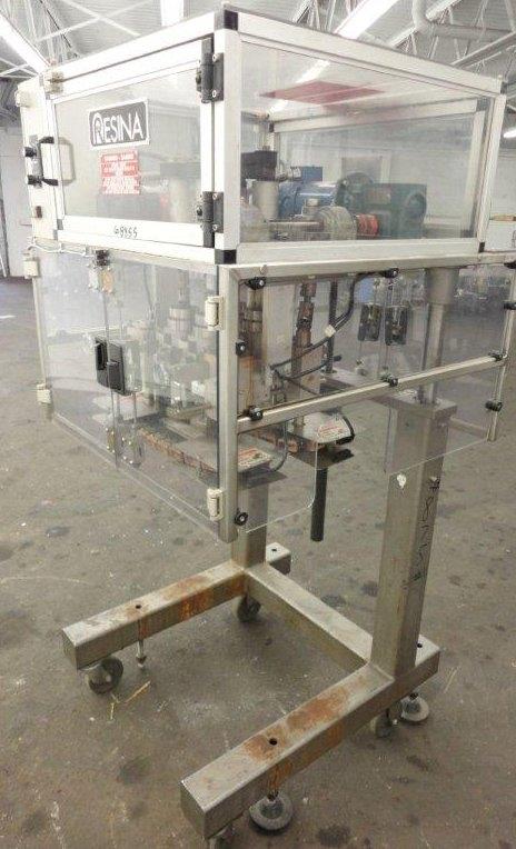 Resina Model RT2026 4 Quill Cap Retorquer with Variable Speed Quills and Gripper Belts. Capable of Speeds Up to 90 Bottles Per Minute. Cap Size Range: 13mm to 38mm. C Frame Design. 1 in H Gripper Belt, Height Adjustable, 1/2 HP Drive, Mounted on Portable C/S Stand with Casters