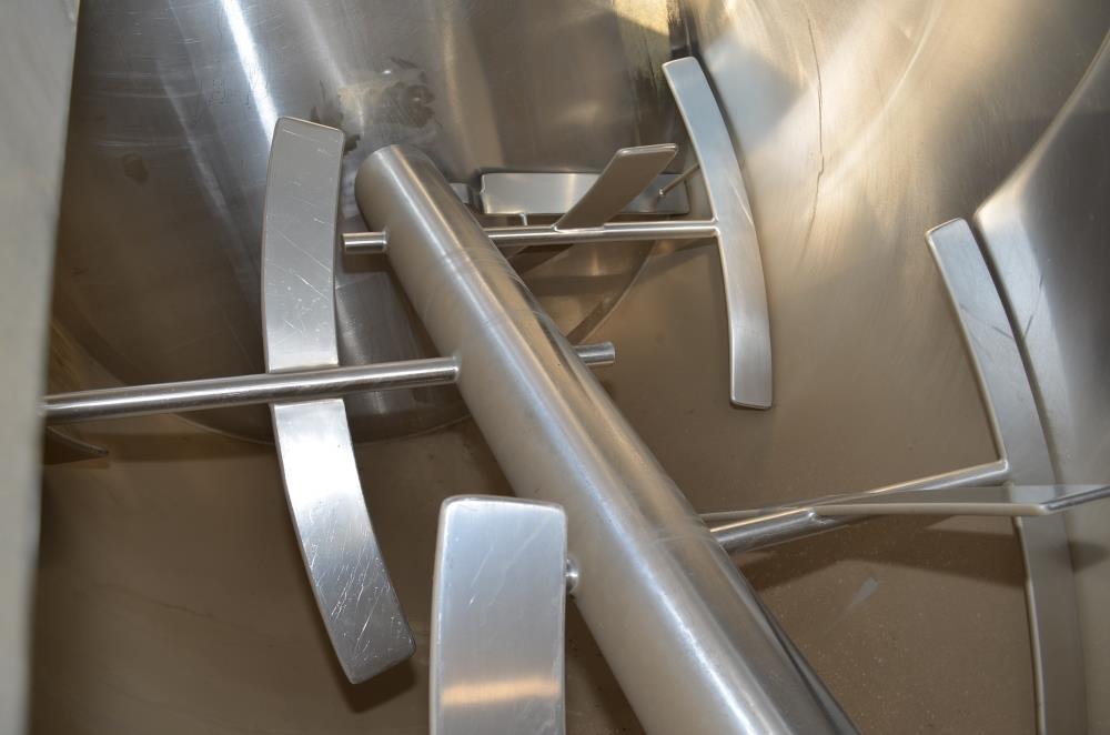Rietz Bepex Model RC60 S/S Single Wall Horizontal Creamer. Approx 130 Cu Ft Total Capacity. 71 in L x 57 in W x 56 in D Chamber. 4 in W Mixer Blades on 1 1/2 in Diameter Posts. 6 in Diameter Center Shaft. 4 in Diameter Tri-Clamp End Bottom Discharge, 5 in Discharge Height. (2) 3 in Diameter Tri-Clamp End Top Inlets, One on Each End. (1) 2 1/2 in Diameter and (1) 1 1/2 in Diameter Tri-Clamp Side Top Inlets. (2) S/S Hinged Covers. Hydraulically Driven (4) S/S Legs.
