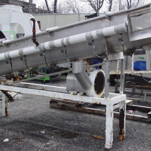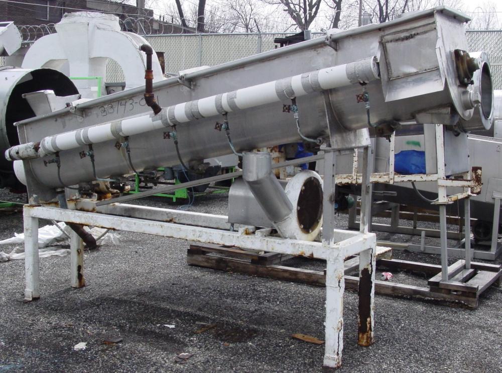 16in. W X 10ft. Long Rietz Model Tl-16-k2210 S/S Steam Blancher Serial #60169 Approx Inside Dimensions: 16in. W X 10ft. L X 17in.Deep Approximately: 13.0 Cubic Ft. - Screw Diameter: 16in. With 7 - Steam Injection Ports 1 - 6in. Diameter And 1 - 6in. X 6in. Top Infeeds 6in. X 5in. End Bottom Discharge Opening 54in. Discharge Height, Mounted On Carbon Steel Frame Chain Sprocket Vari-speed Drive