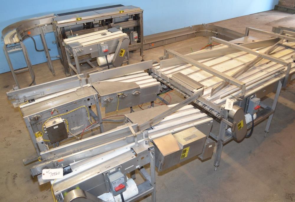 Roe Model RWAVE (2) Directional Discharge Conveyor System with Plastic Delrin Chain Conveyor. 64 in L Main Section with 10 in L Bi-Directional Rollers. 4.5 in W Sections Including 87 in L, 104 in L, 34 in L and (2) 90 Degree Sections (Right Side). 8 ft L x 57 in W Accumulation Table with Dual Lane Diverter. (2) 4.5 in W x 6 ft L Single Lane Conveyors. 4.5 in W Sections Including (4) 90 Degree Sections, 102 in L Section, 42 in L x 10 in W Table Top Section (Left Side). 10 Inch and 4.5 Inch Wide Conveyor Chain, S/S Frames and Legs, Drive Motors, Power Switches.