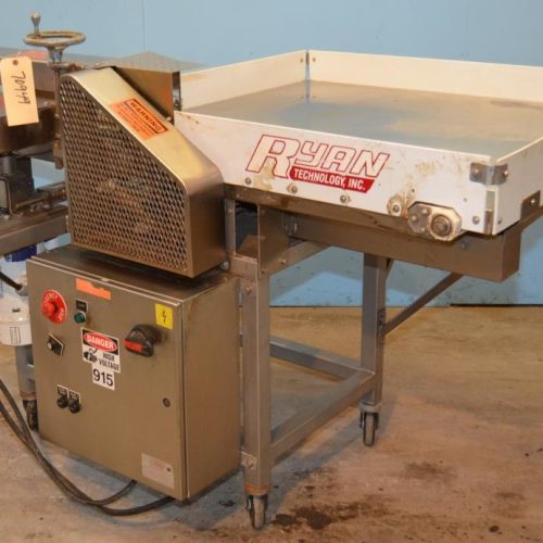 Ryan Model 1193 Dual Blade Horizontal Bread, Bun and Bagel Slicer. (2) 12 in Diameter Circular Blades, Capacity to Handle Products Up To 5.5 in Wide and 3 in Tall. 41 in x 44.5 in S/S Accumulation Table with Plastic Side Walls, 4 in W x 32 in L Top Infeed Belt, 4 in W x 60 in L Bottom Infeed/Discharge Belt with Adjustable Side Rails, 2 1/4 in W S/S Discharge Track, Adjustable Height Top Infeed Belt, Variable Speed Blades, 1/2 HP Conveyor Drive (208 V, 3 Ph, 60 Hz).