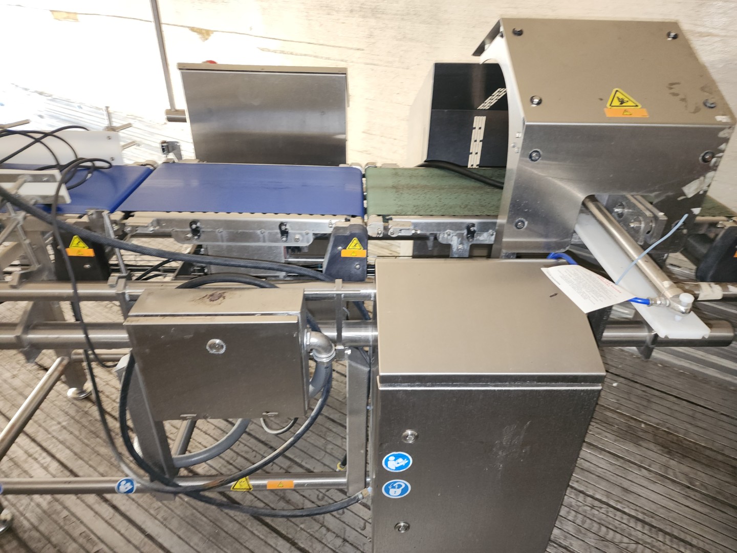 Safeline Model C3352 Checkweigher. Weigh Range 7 g – 7,500 g. Speeds up to 300 PPM, Pneumatic Pusher Reject, 12 Inch Data Screen, 120/240V, 50-60Hz, Max Air Pressure: 80PSI.