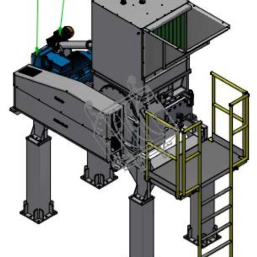 Seibt Model MGHS 150/100 A2 150 HP Granulating Mill. Two-part grinding box made of SAE 1020 sheet steel. Bearing housing in SAE 1020 steel. Industrial screen housed in an articulable magazine. Industrial screen with thickness of 9.52 mm. Double-walled feeding nozzle filled with anti-noise material. Rotor with side discs and 06 knives positioned in scissor cut, with six interleaved cut points. Over funnel and feed funnel made of stainless steel. Inner plates of the feeding nozzle built in stainless steel plate. Outlet nozzle built in stainless steel plate. Rotor axle in SAE 1045 steel. Device/template for adjusting its knives outside the mill. 150 hp three-phase electric engine, 4 poles, voltage as needed. Industrial screen with optional holes in 12, 14, 16, 20, 25mm or special. 4 fixed and 6 rotating knives made in special VND steel.