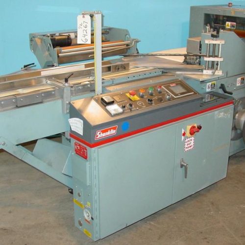Shanklin Model F1 hortizontal flow through shrink wrapper complete with Shanlin T7F s/n T00209 shrink tunnel. 18 in w horizontal cutting bar, 12 in side seal w/ powered scrap take up wheel, Package size: Minimum 1/2in W x 1/8in H x 4in L. Maximum 16in W x 6in H, Maximum film width 22in folded or 44in flat. 50 PPM maximum. 60 linear feet per minute max film speed. 13 in rubberized belt indeed w/ pnuematic product stops, 25 in W film rollers, (2) 5 1/2 in W x 20 in L rubberized outfeed belt, Longitudinal Seal: weld bead at side of package. Transverse Seal: Standard hot knife jaws. 1/230/60, 20 Amps, T7F Shanklin Tunnel: S/N T00209, 21 in W x 9 in H tunnel opening, 3/230/60, 7.8 amp, 6 ft L x 15 in W mesh belt, 3/4 HP top mounted blower, Fully automatic Shanklin FloWrap machines are continuous motion horizontal Form Fill Sealers designed to wrap packages effortlessly and efficiently. Built for peak performance, durability, and versatility, programmable controller with user friendly touch screen control panel for ease of set up, operation and maintenance; includes help diagnostics tool that automatically displays machine faults and corrective actions at the push of a button, Adjustable product spacing and end seal placement accommodate product length and spacing changes for fast and simple product size changeover, Electrical controls are UL listed for meeting the highest safety standards. efficient side sealing wrappers shrinkwrap product with neat trim seals on three sides of the package, handling even irregular shapes with ease. The inverting heads do not require a precise matching of film width, thus allowing you to run many sizes of packages with only a moderate selection of film widths. F1 Features a belt infeed that accepts intermittently delivered and randomly spaced product, setting the correct spacing by controlling the infeed belt speeds. Can also handle random product length for uninterrupted operation. The SHANKLIN Shrink Tunnel tailors the velocity and temperature of the air to favor the wrapping film. Large quantities of heated turbulent air are cascaded into direct contact with the package at velocities as high as 3,000 feet per minute. The air is hot enough to effect excellent uniform shrink, but is not so hot as to melt the wrapping film. This air circulates over 50 times per minute past a temperature controller sensing element that maintains uniform temperature throughout the tunnel, eliminating hot spots.