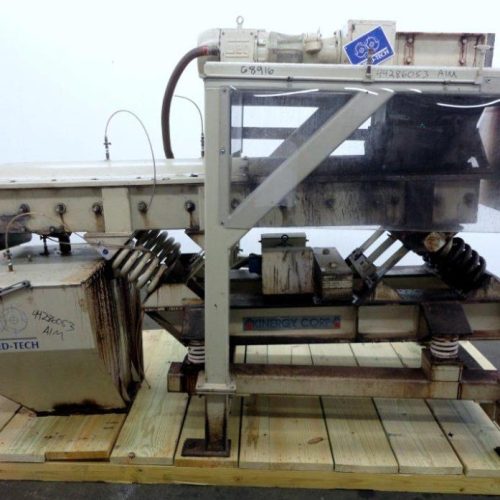 Shred Tech Twin Shaft Carbon Steel Industrial Shredder. Approximate 13-1/4 in x 15 in feed opening with hopper. Dual intermeshing blades. Driven by a 7.5 HP, 3/60/208-230/460 volt gear motor. Includes a Kinergy model KDSNED18SD vibratory screener, serial#KDSN6353. Approximate 22 in wide x 96 in long, and a staircase, mezzanine, and carbon steel frame.