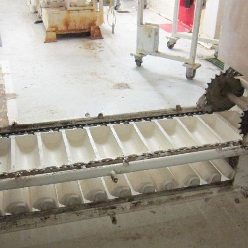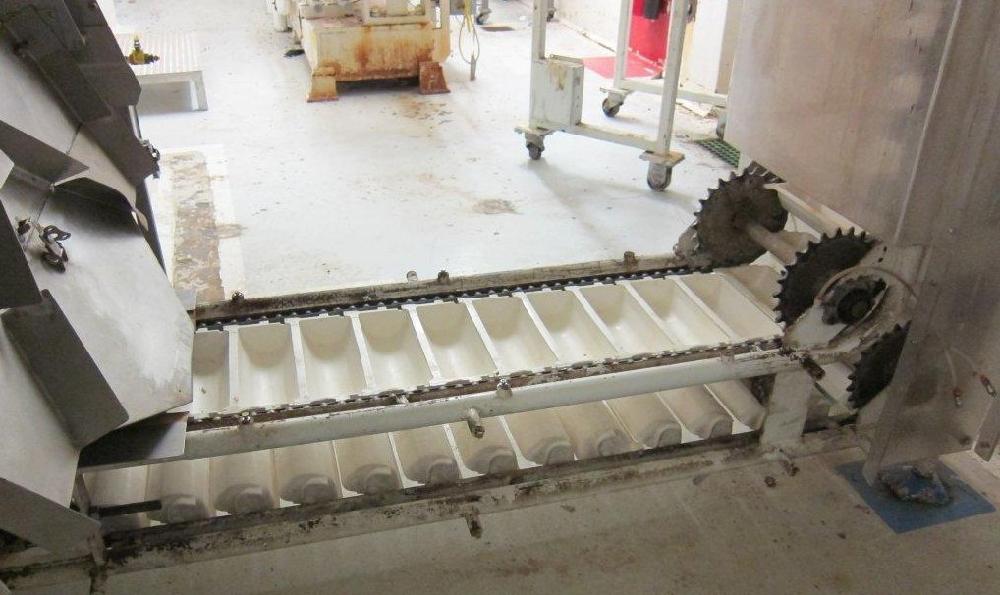 Smalley Bucket Elevator with Carbon Steel Frame and Approximate 17 ft Discharge Height, 12 in x 4.5 in 6 in Plastic Buckets, with Drive. 6 ft Bottom Horizontal Infeed Section, 12 ft 8 in Top Horizontal Dicharge Section.