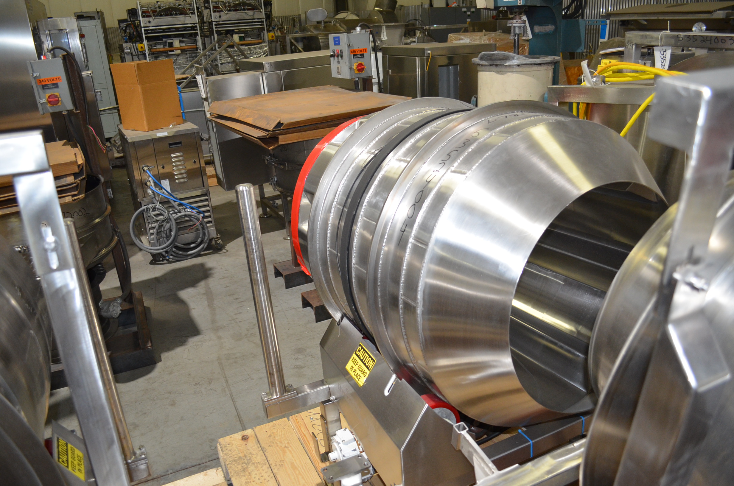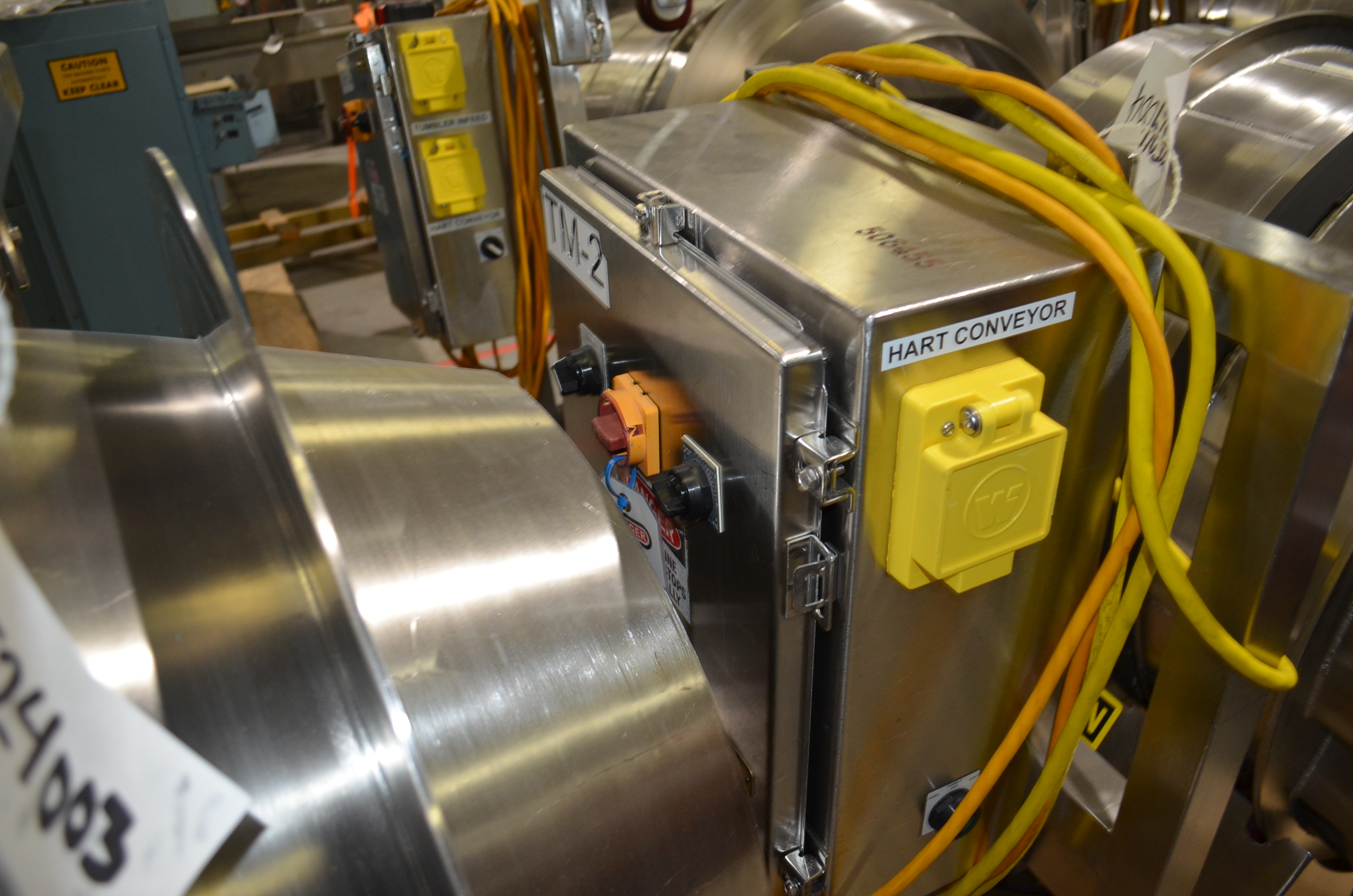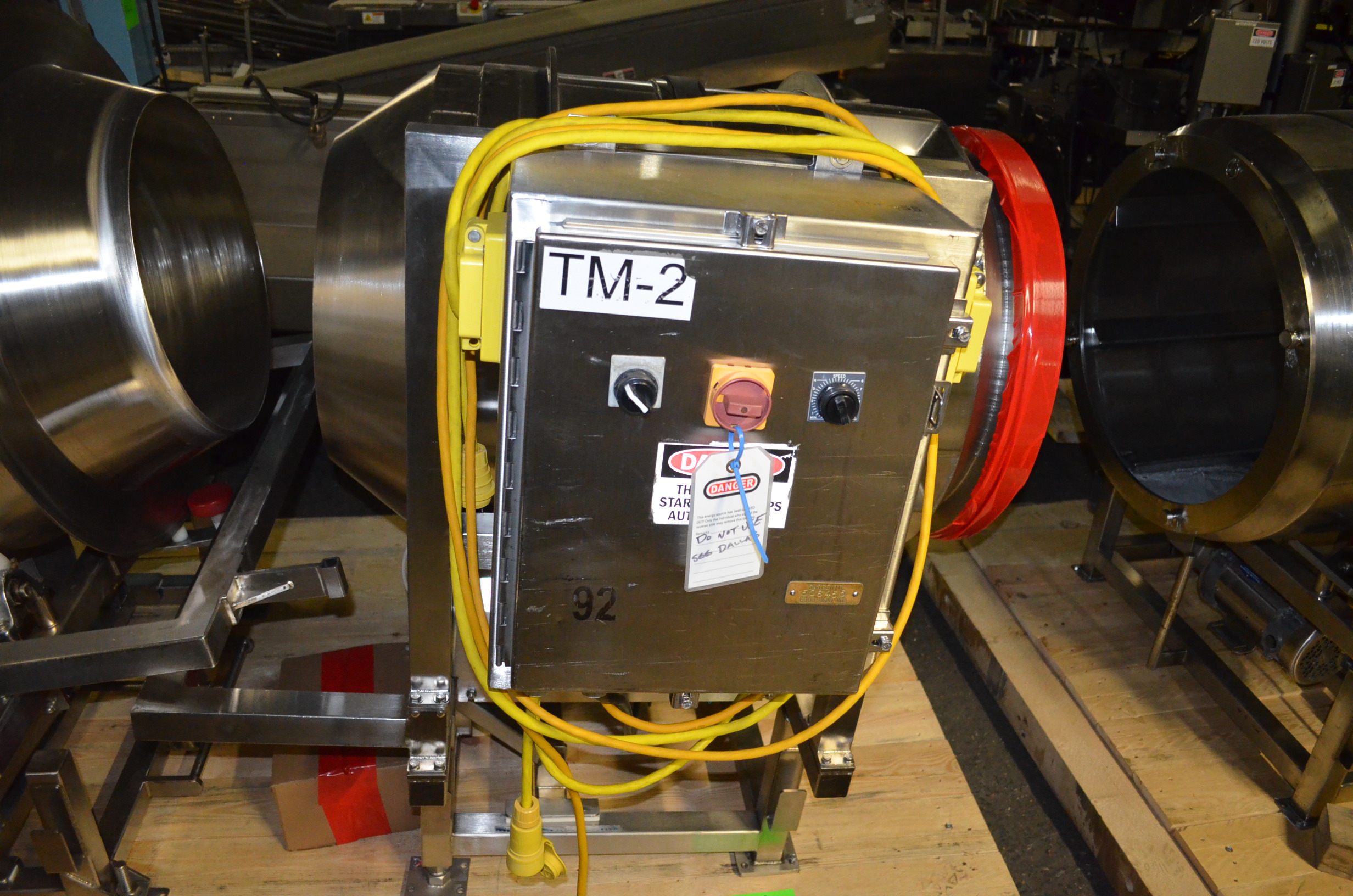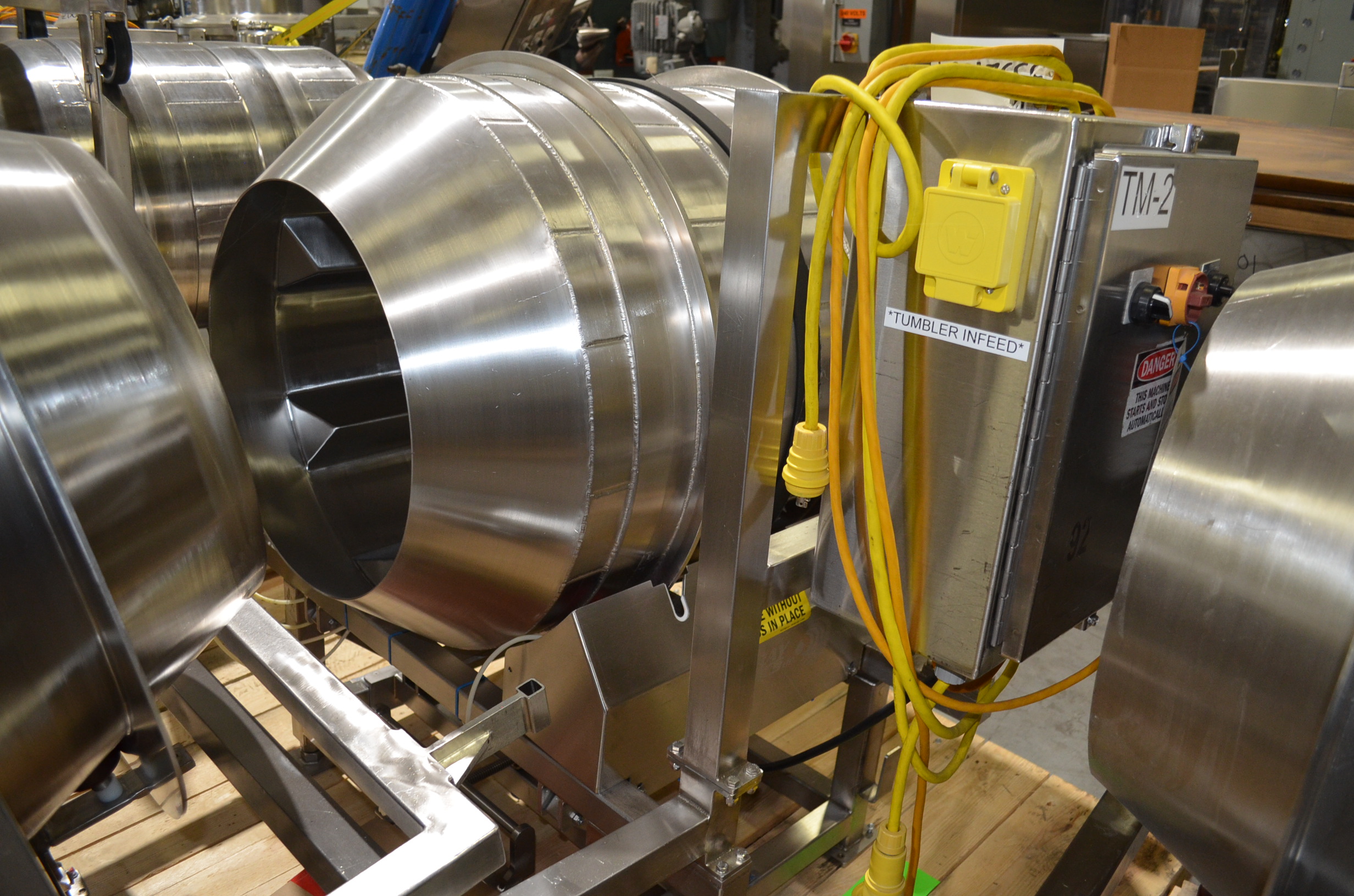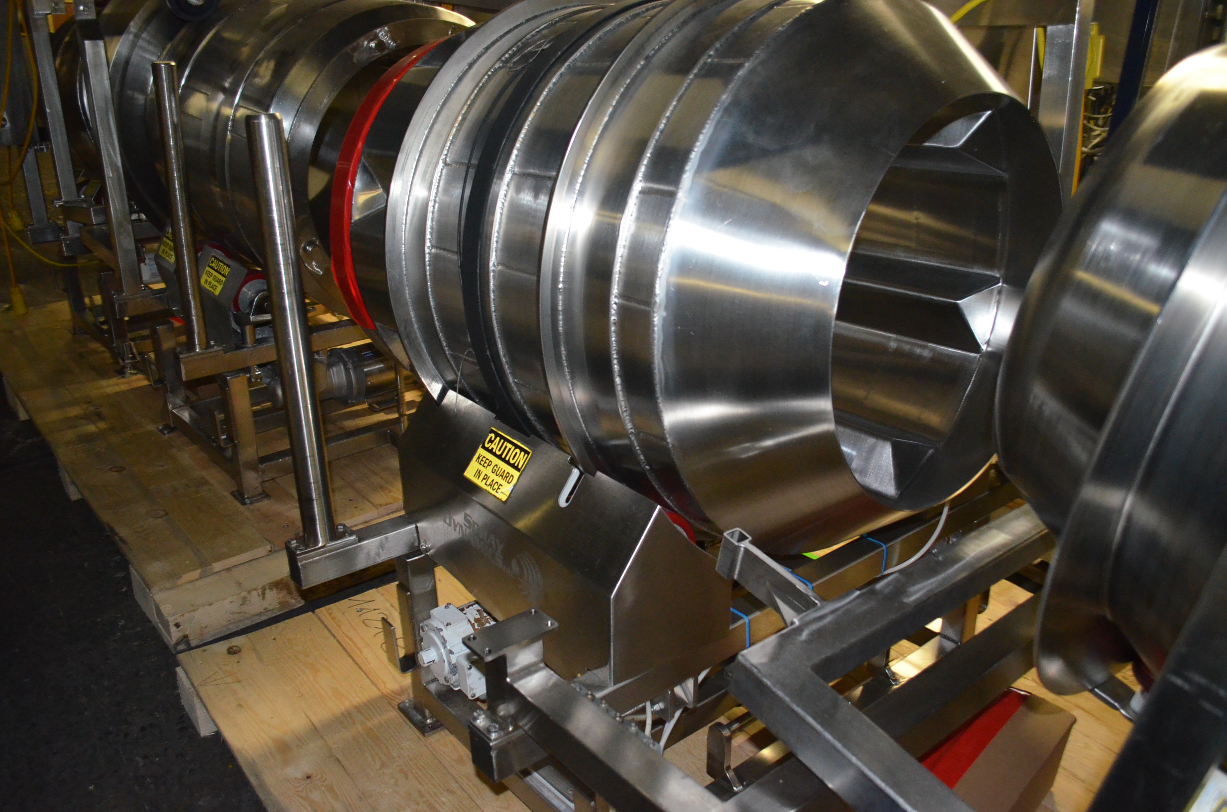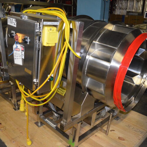 Spray Dynamics S/S Soft Flight Seasoning Drum. Approx. 30 in Interior Diameter x 43 in Total Drum L. (8) 1.5 in H x 28 in Long Eccentric Flights, Adjustable Pitch, 20 in Diameter Inlet End, 23 1/2 in Diameter Discharge End. Variable Speed, S/S Frame with Casters. 1/2 HP, 1750 RPM. 120V, 1 Ph, 60 Hz.