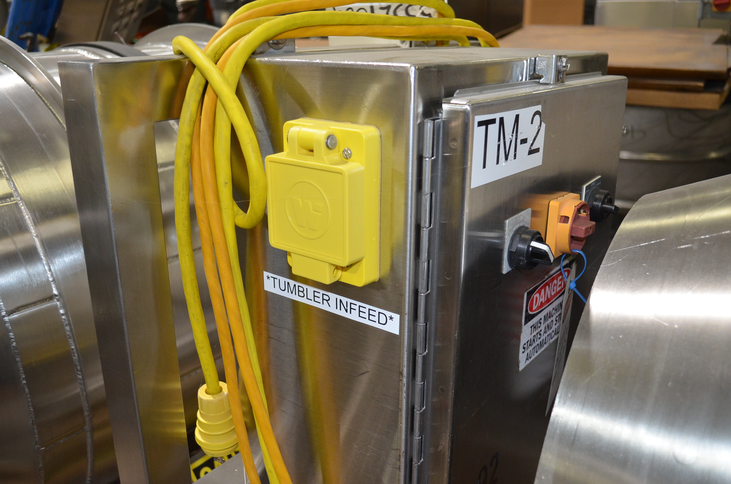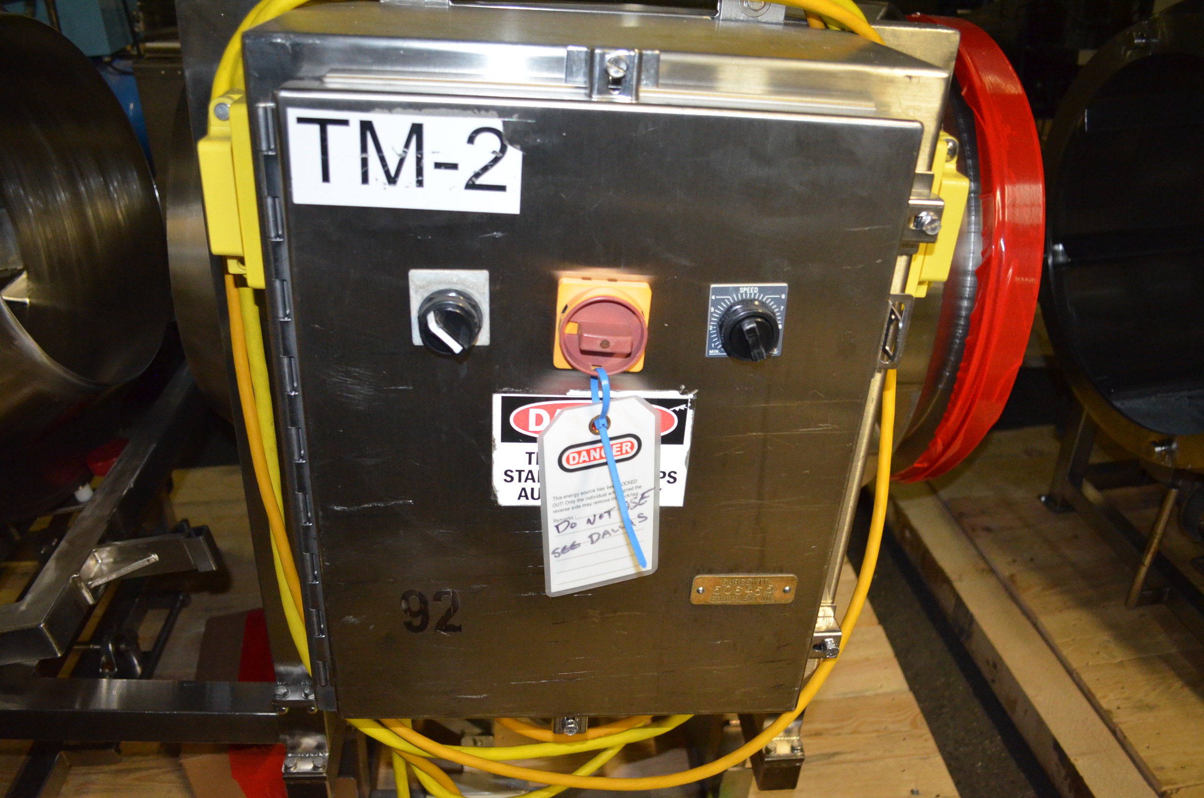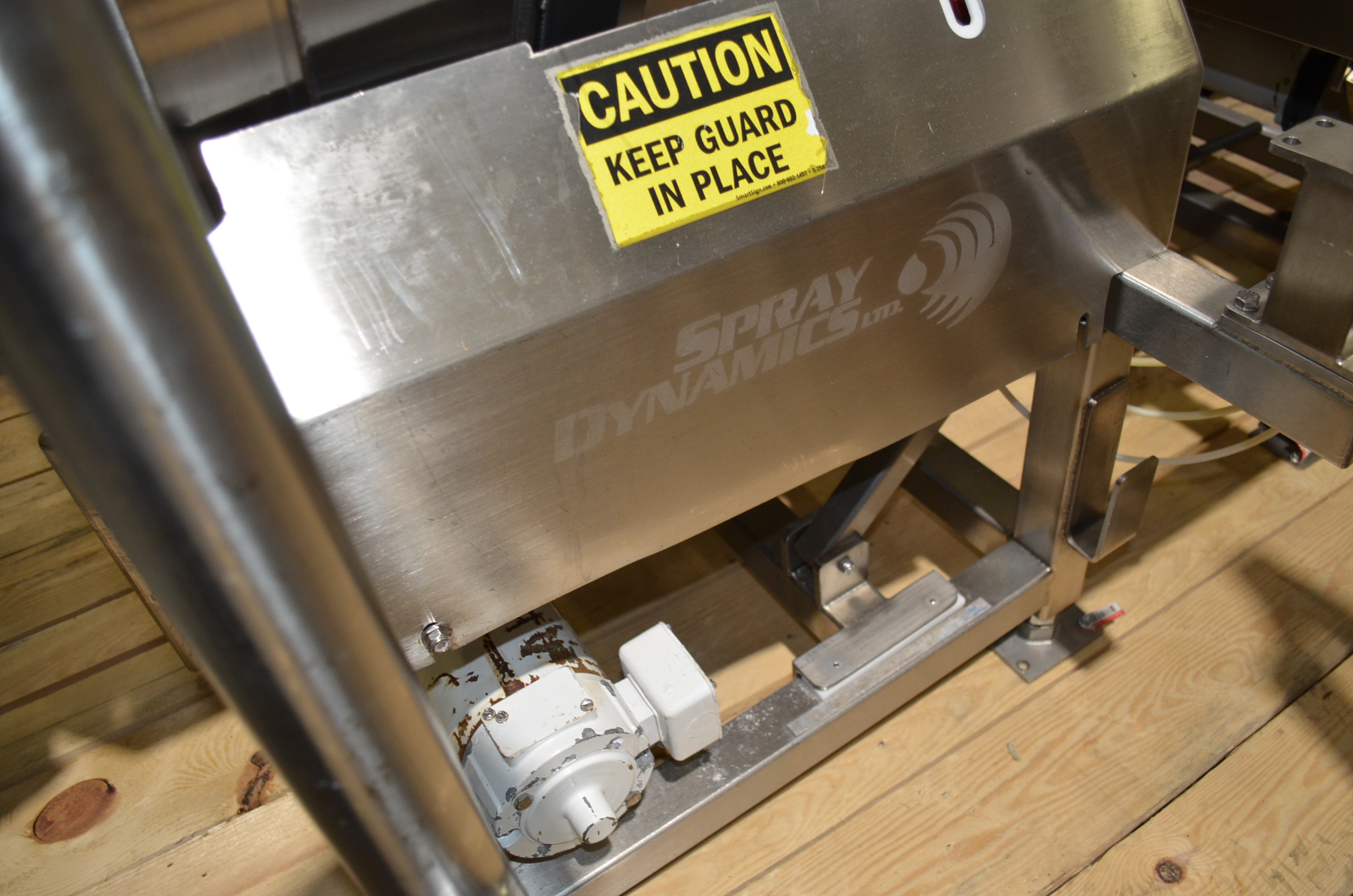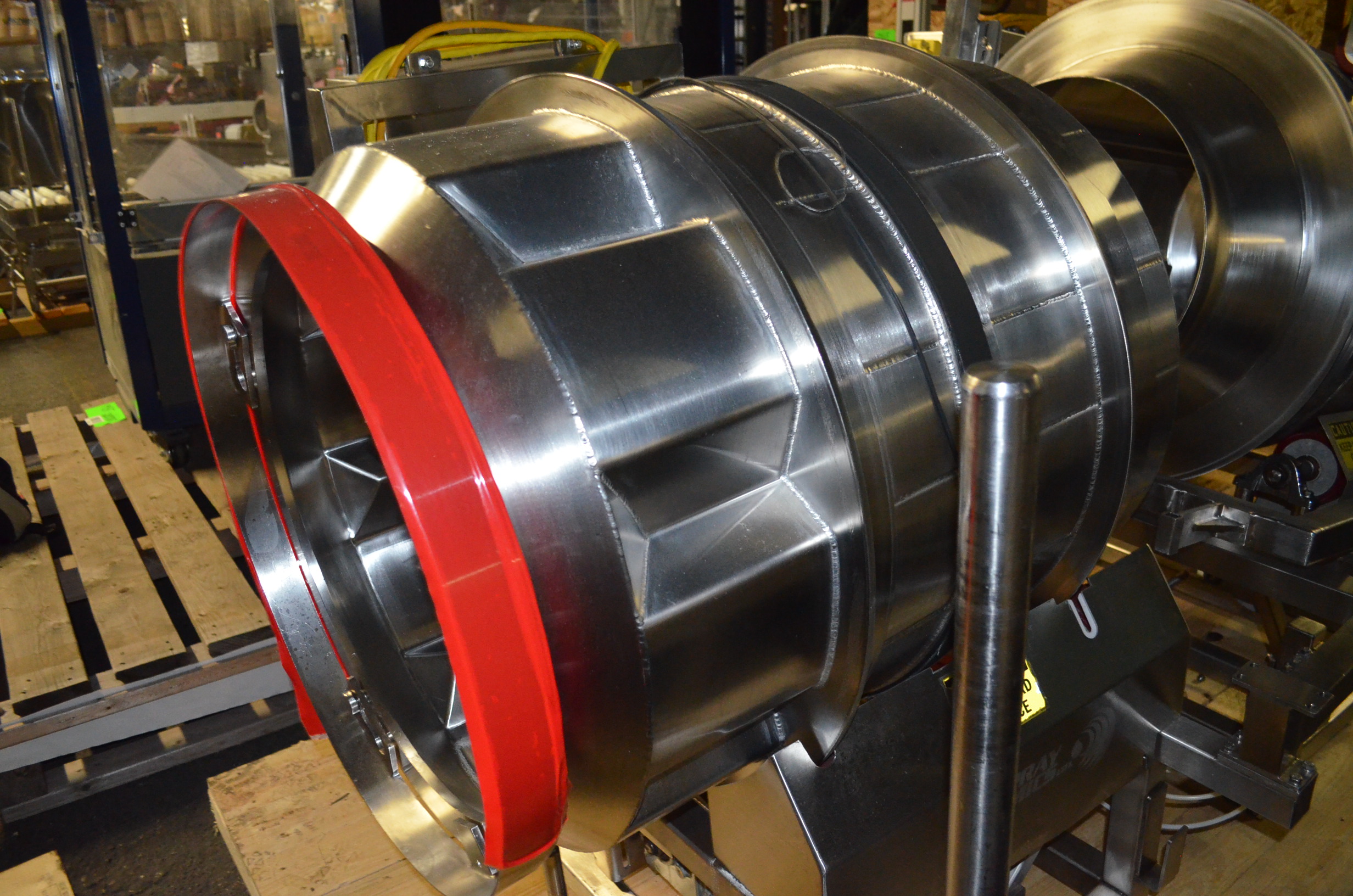 Spray Dynamics S/S Soft Flight Seasoning Drum. Approx. 30 in Interior Diameter x 43 in Total Drum L. (8) 1.5 in H x 28 in Long Eccentric Flights, Adjustable Pitch, 20 in Diameter Inlet End, 23 1/2 in Diameter Discharge End. Variable Speed, S/S Frame with Casters. 1/2 HP, 1750 RPM. 120V, 1 Ph, 60 Hz.
