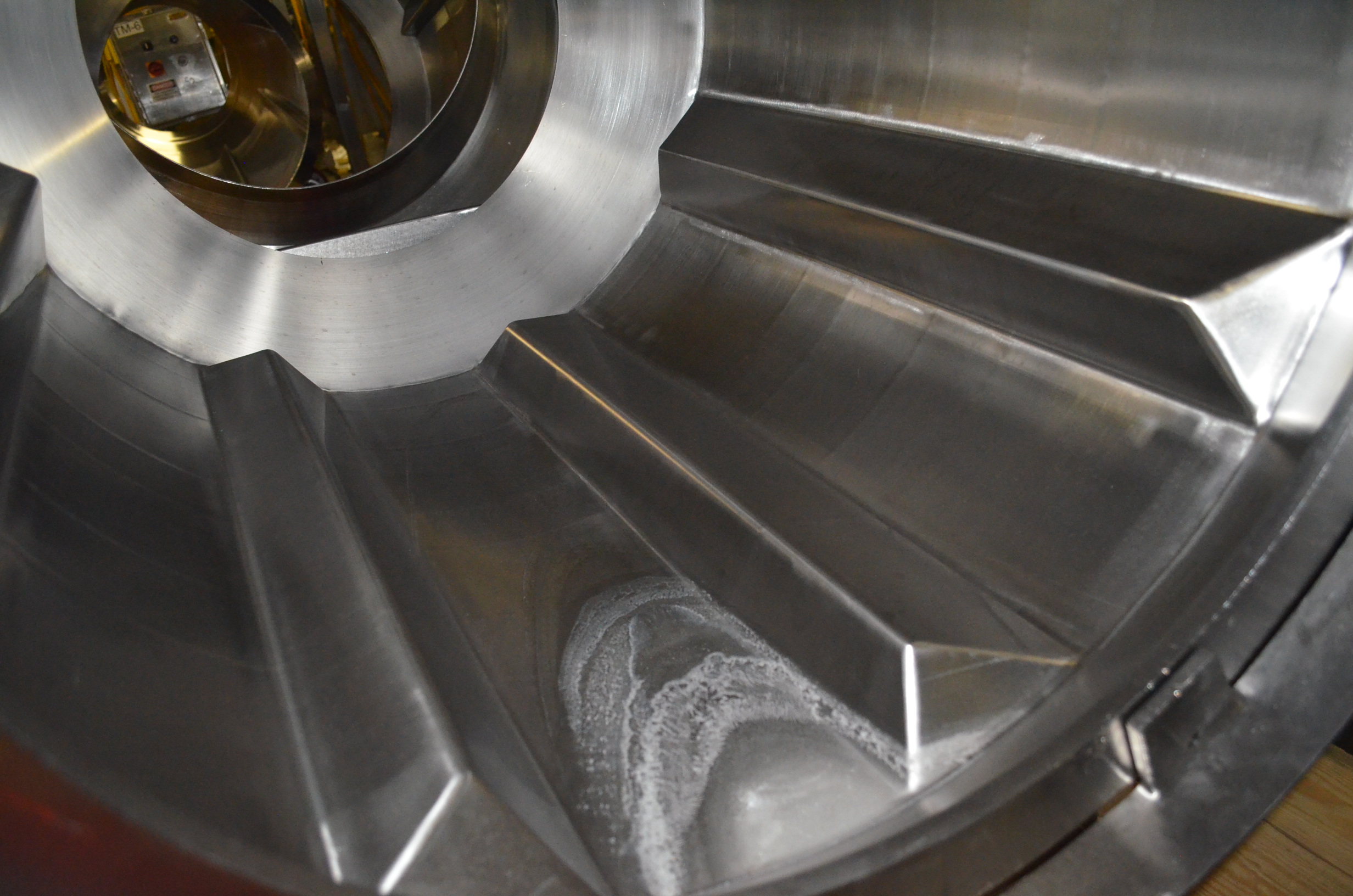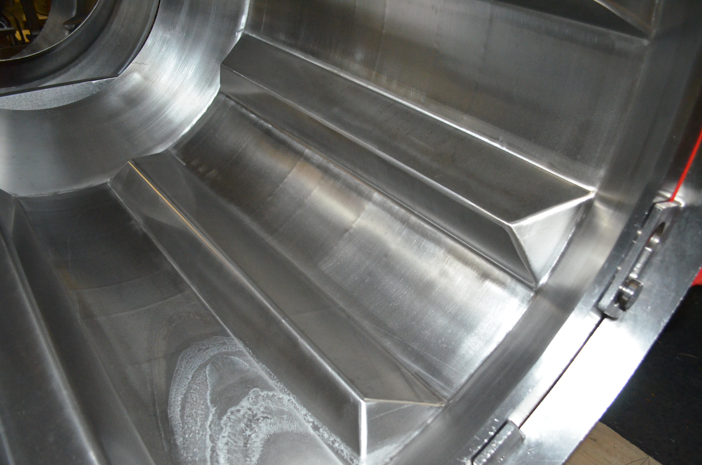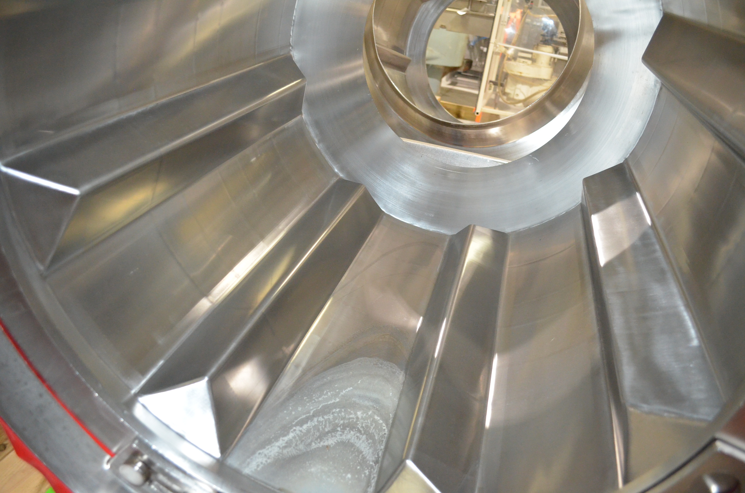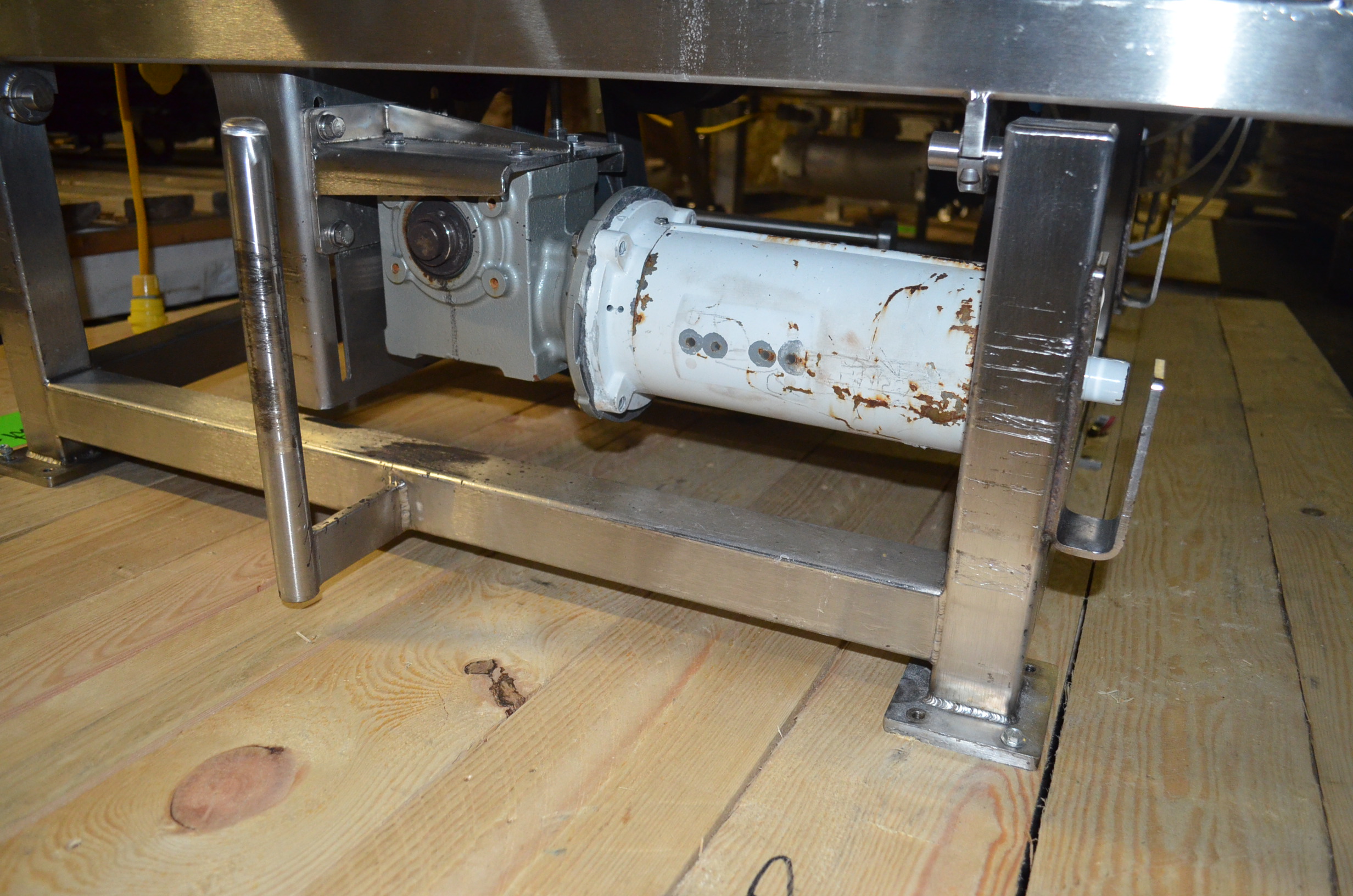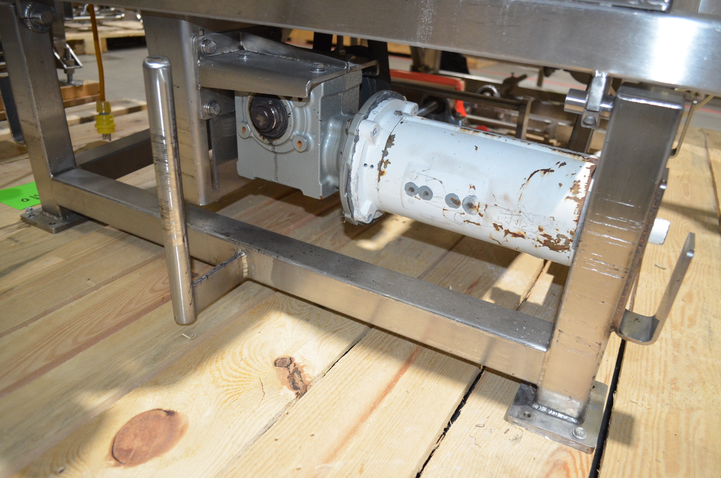 Spray Dynamics S/S Soft Flight Seasoning Drum. Approx. 30 in Interior Diameter x 43 in Total Drum L. (8) 1.5 in H x 28 in Long Eccentric Flights, Adjustable Pitch, 20 in Diameter Inlet End, 23 1/2 in Diameter Discharge End. Variable Speed, S/S Frame with Casters. 1/2 HP, 1750 RPM. 120V, 1 Ph, 60 Hz.