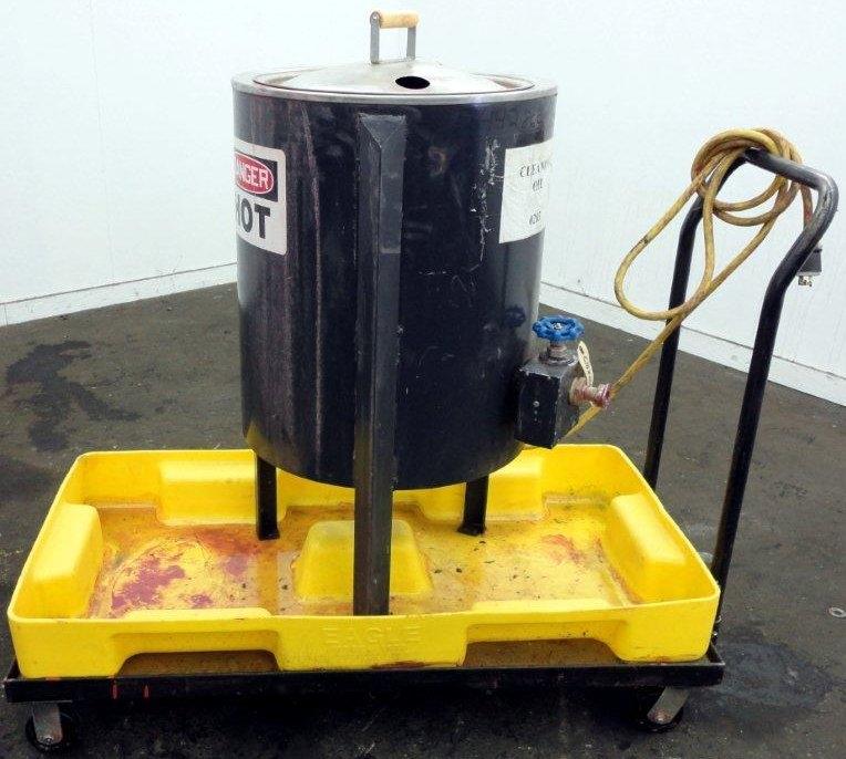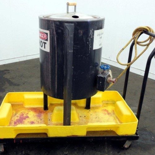 Sta-Warm Model 53WSSS Approx. 25 Gallon Electrically Heated Compound Melter. 18 1/2 in Diameter x 21 1/2 in Deep, 1 1/2 Diameter Tri-Clamp Side Bottom Outlet, Lift Off Lid, S/S Interior, C/S Exterior, with Portable Cart and Spill Containment Tray, 208V, 16.6 Amp, 60 Hz, 3Ph