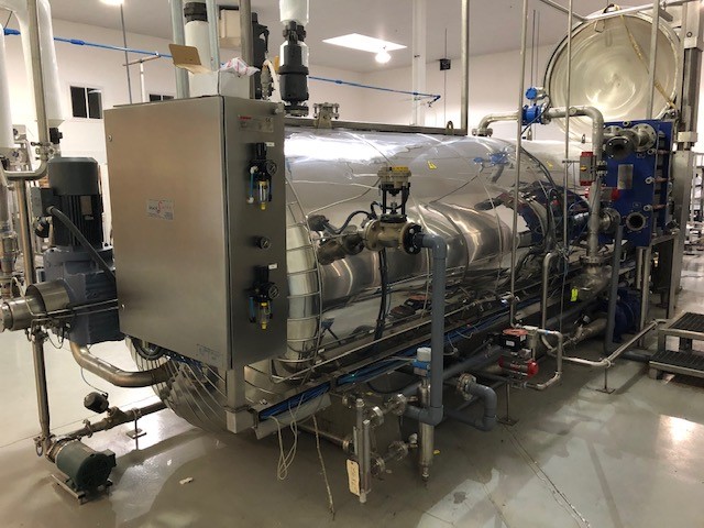 Stock Surdry S L Model AR175 1,700mm 5-Basket S/S Horizontal Rotary Batch Retort with S/S Interior and Exterior, National Board Number 45. Vertical Hydraulically Operated Door with Hydraulic Power Pack, Maximum Working Pressure 71.1 PSI at 300 Degrees F, 480V, 60 Hz, 33.75 kW. Equipped with Alpha Laval Type M10MFG Plate and Frame Heat Exchanger with Inlet Volume of 23.6 L and Output Volume of 22.6 L, Design Pressure 0-10 Bar Inlet and Outlet, Design Temperature 75/150 Degrees C Inlet and 0/85 Degrees C Outlet, Year Built 2005. KSB 45kW C/S Centrifugal Pump with 4 in Diameter Flanged Inlet and 3 1/2 in Diameter Flanged Outlet, 3540 RPM, 460V, 60 Hz. Stainless Steel Control Panel. Steam Train, Values, Piping etc on Multiple Pallets. Total Weight Empty 9,921 Pounds, Total Weight with Baskets 18,739 Pounds, Total Weight in Operation 20,282 Pounds. Ideal for Applications Such as Soup, Sauces, Vacuum Canned Corn, Milk Drinks, Natural Tuna, Sausages, Mushrooms in Oil, Large Canned Vegetables.