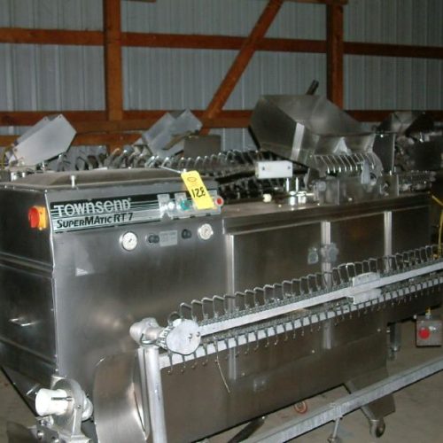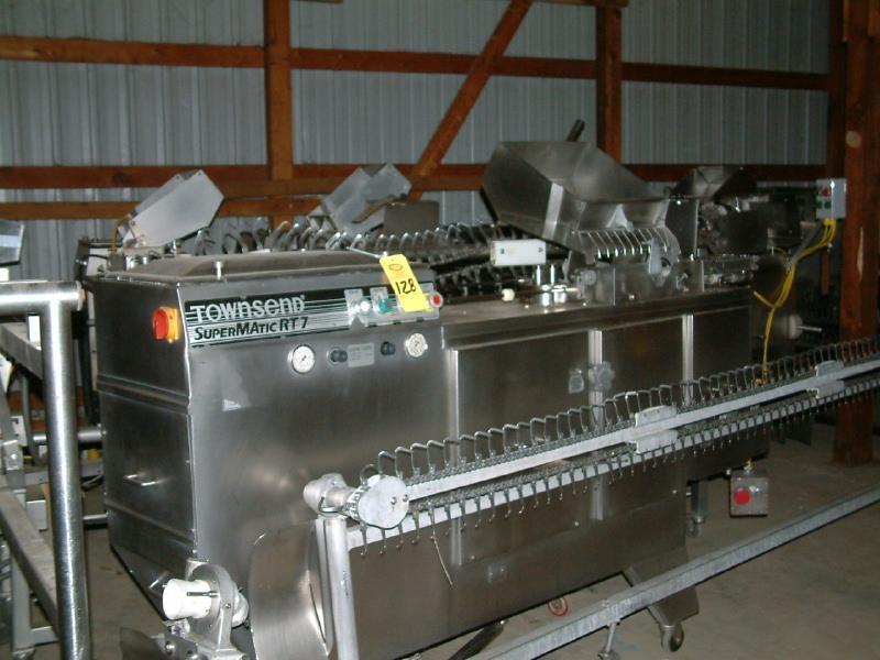 Townsend Mdl. RT7 Supermatic Linker SC#9442K S.S. w/looper conveyor, 5 h.p., 220 volts, 3 phase, 14.4 amps., Mfg. 1989., with extra linking heads. (1) 2.25in L X 6 pitch, (2) 2.63in L X 7 pitch, (3) 3.75in X 10 pitch, (5) 4.88in L X 13 pitch, (6) 5.25in L X 14 pitch, (7) 5.63in L X 15 pitch