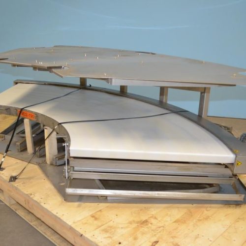 Transver 44 in W Flat Belt 90 Degree Turn Conveyor. Food Grade Belt. S/S Frame with Tabs For Ceiling Mounting. Approx 54 in W Curve in Front, Approx 126 in W Curve Across Back. S/S Cover. On/Off Controls. .55kW Motor, 480 V, 3 Ph, 60 Hz, 1690 RPM.