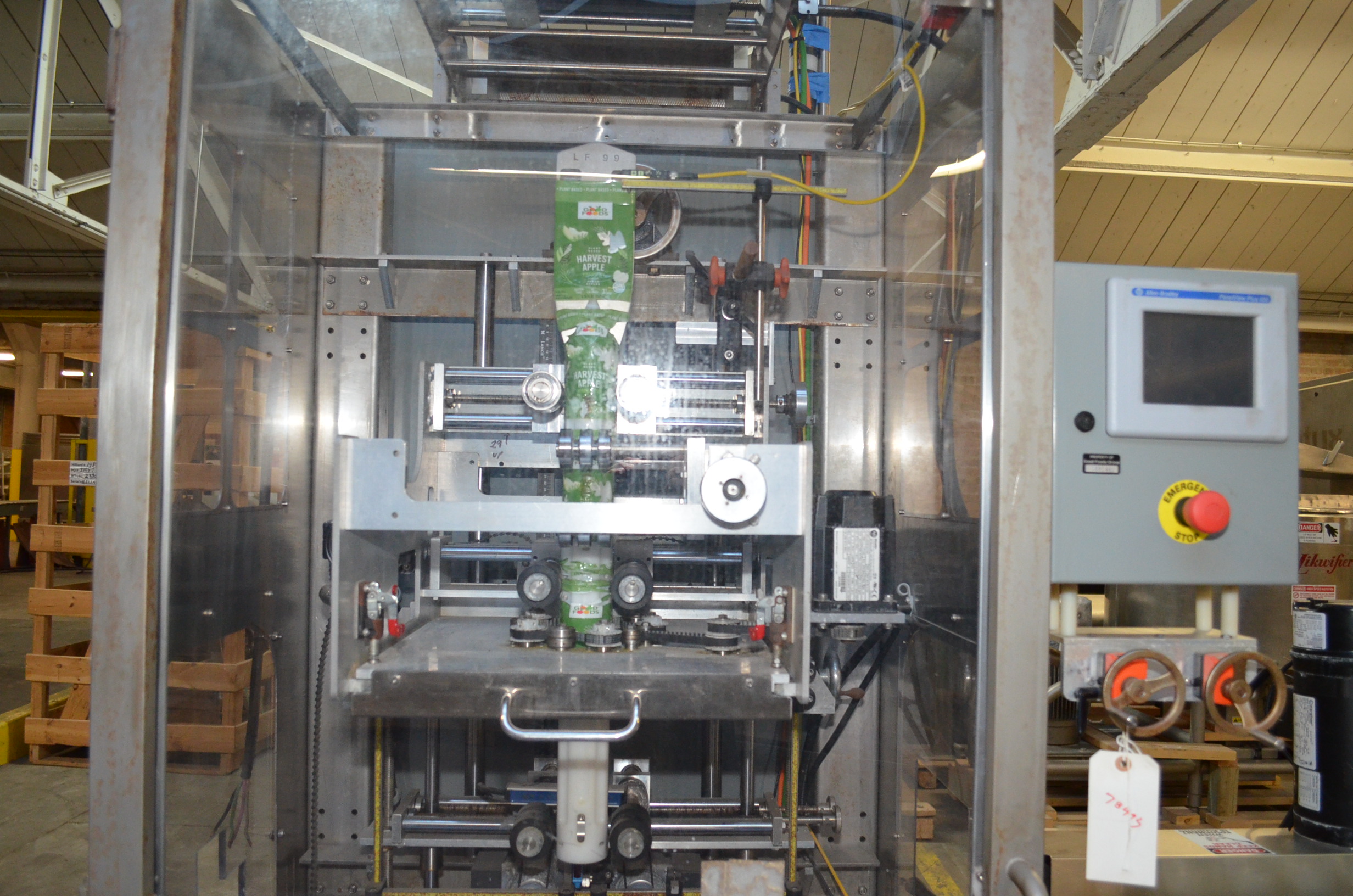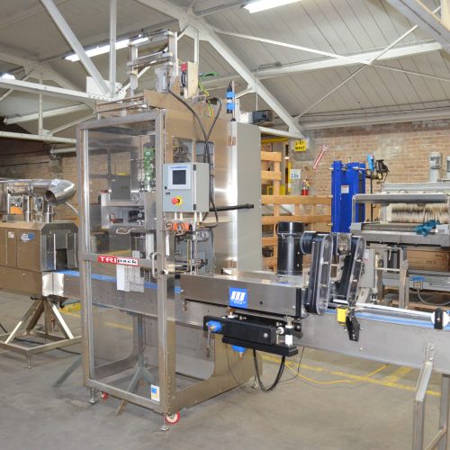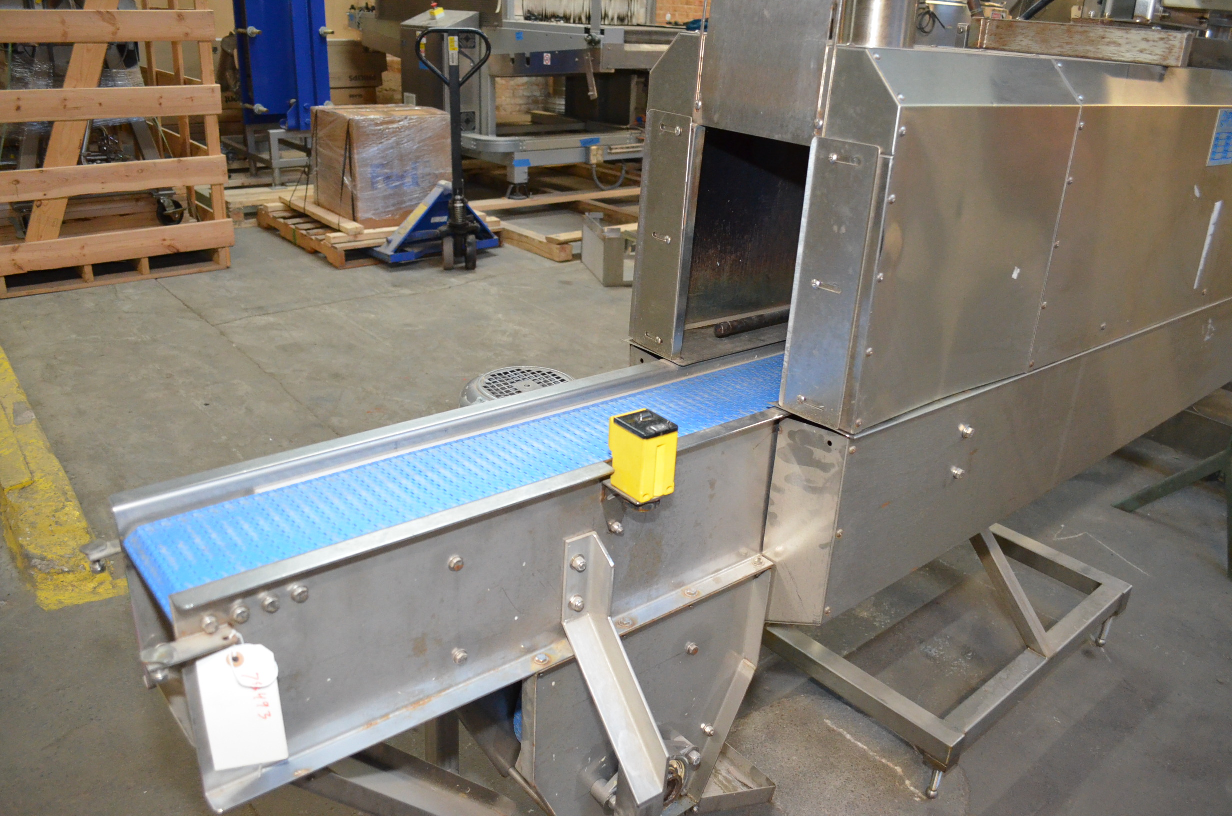 TriPack Model MSA400 Shrink Sleeve Labeler. Single Mandrel. Maximum Speed 400 PPM. Product Diameter 1 in – 10 in. Layflat Range 40mm – 400mm. Cut Length 30mm – 250mm. Allen Bradley Panelview Plus 600 HMI. With 6 in W x 117 in L Plastic Interlocking Chain Infeed Conveyor with Morrison Model 1672715 Screw Indexer with (2) 32 in L Screws, S/S Frame, 1/2 HP Drive. 6 in W x 117 in L Plastic Interlocking Chain Discharge Conveyor, S/S Frame, 1 HP Drive. PDC Model KST55712 6 ft L Over-Belt S/S Steam Shrink Tunnel with Digital Temperature Controller, Maximum Tunnel Opening 7 1/4 in W x 12 in H with Adjustable Height and Width Sliders. Hot Water Set on S/S Stand. 220 V, 3 Ph, 60 Hz, 30 Amp.