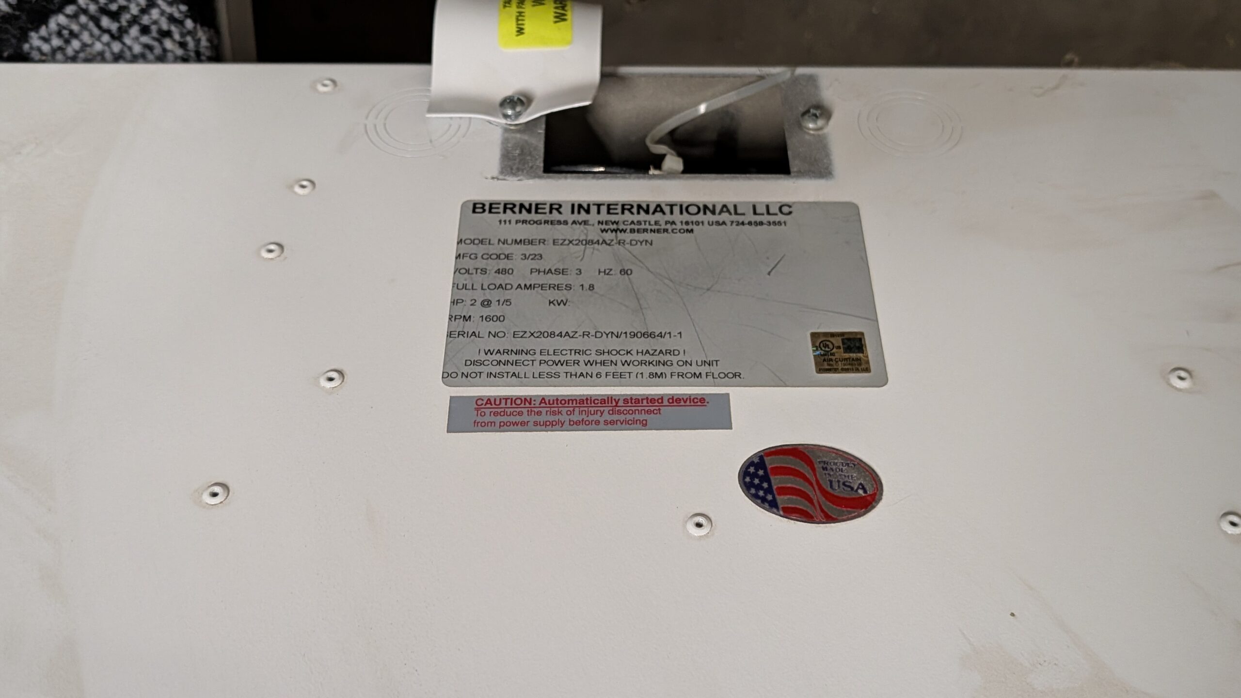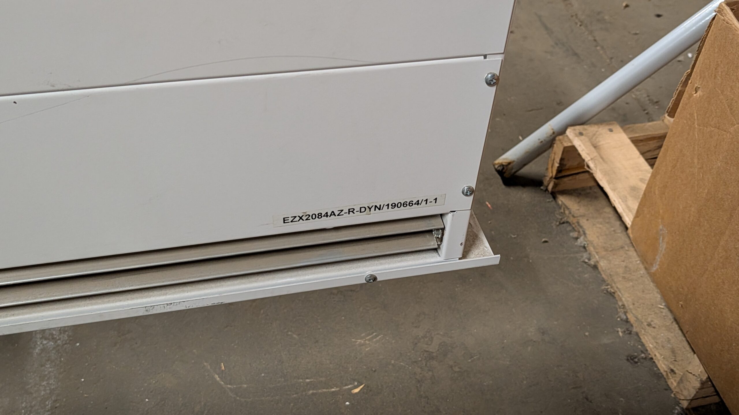 UNUSED Berner International Model EZX2084AZRDYN 7-Foot-Long Low Profile Air Curtain. 8.5 in H x 13.5 in Deep. 1/5 HP Two Speed Motor. White Powder Coat Finish. 480 V, 3 Ph, 60 Hz.