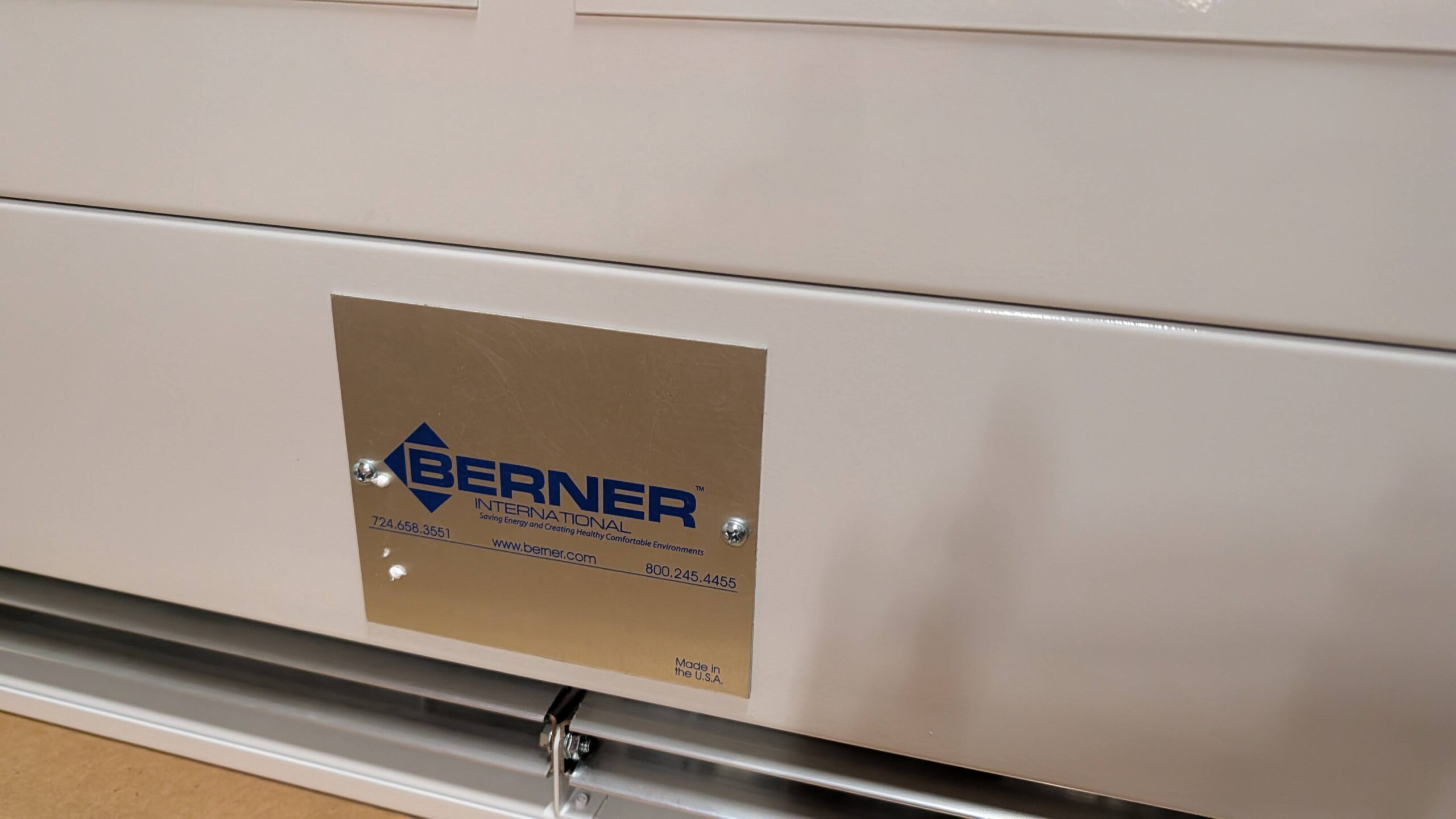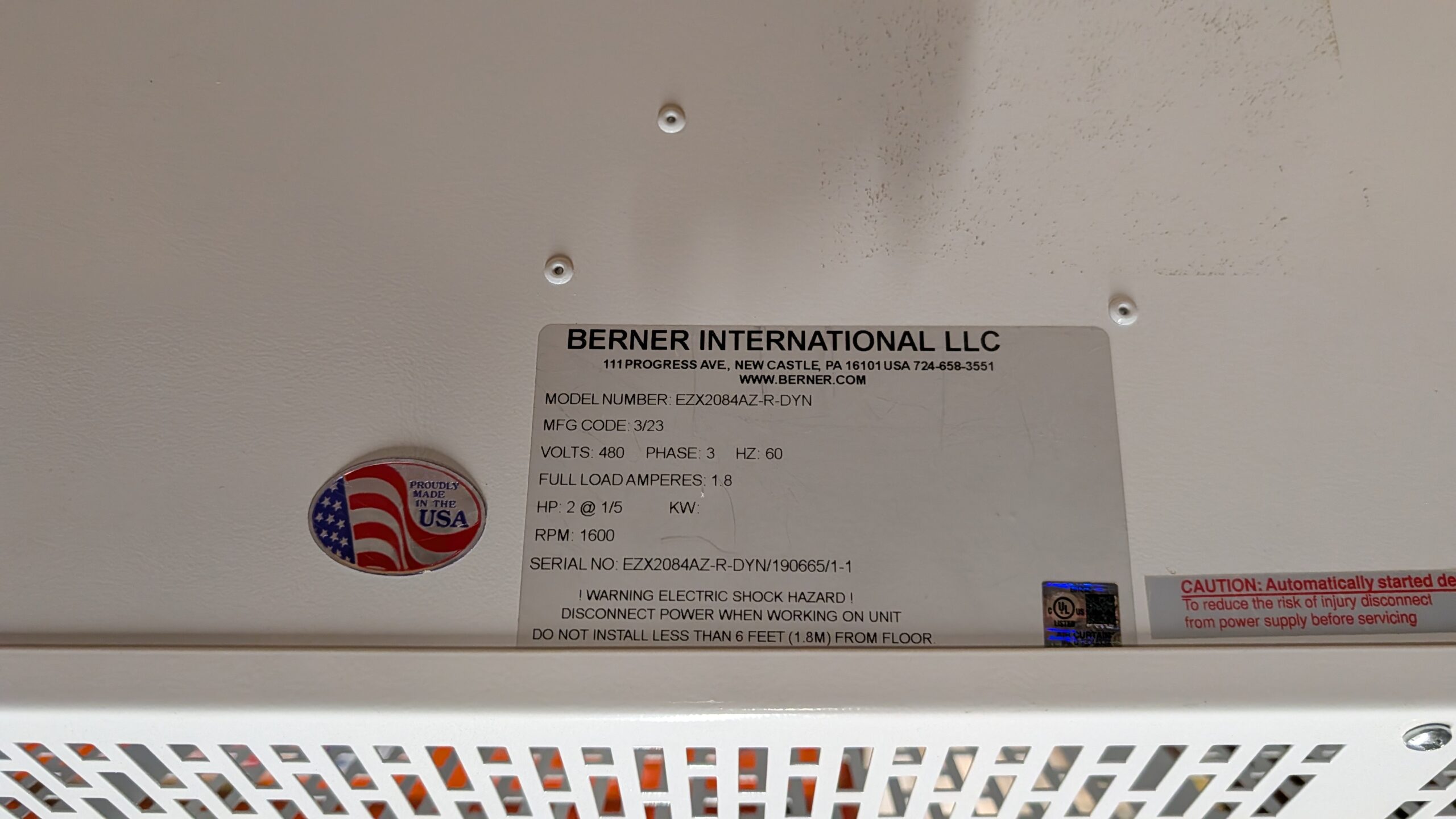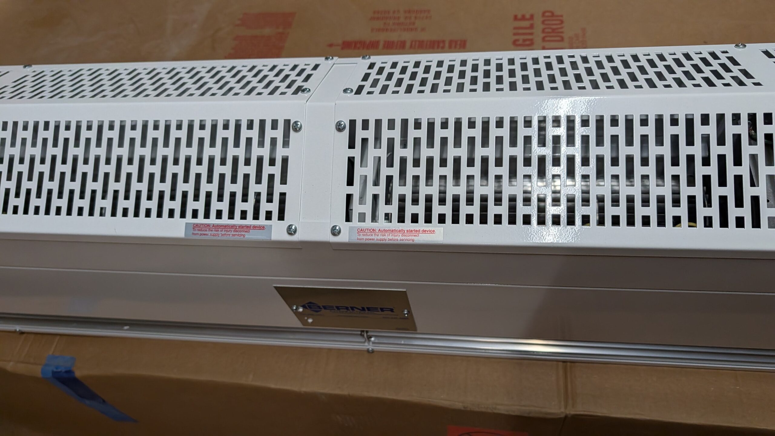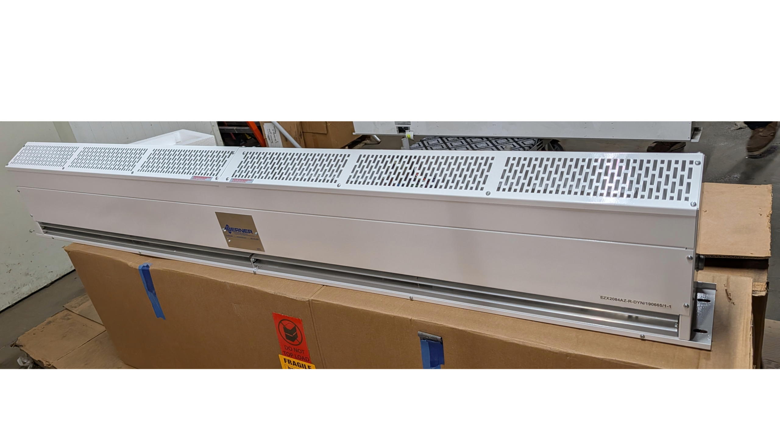 UNUSED Berner International Model EZX2084AZRDYN 7-Foot-Long Low Profile Air Curtain. 8.5 in H x 13.5 in Deep. 1/5 HP Two Speed Motor. White Powder Coat Finish. 480 V, 3 Ph, 60 Hz.